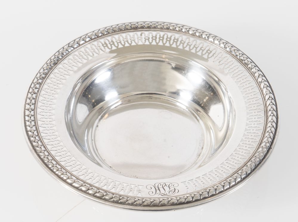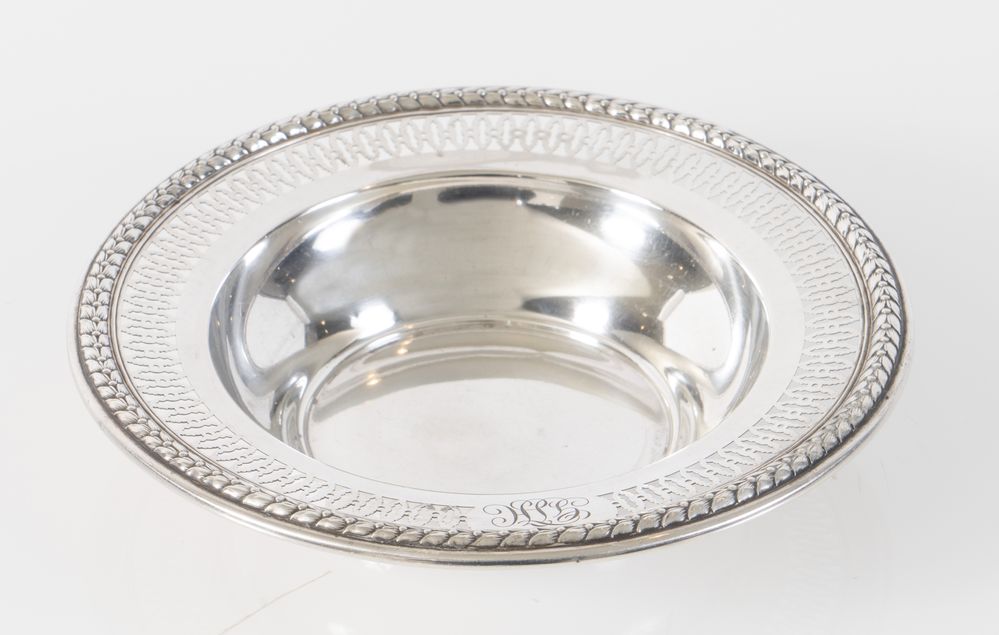 GORHAM, 1925. Piatto in argento 925. sotto la base reca punzoni: Gorham, stemma dell'argentiere, sterling, A12134, piede alato. Cm 3,5x Ø 18. Peso: 125 gr.