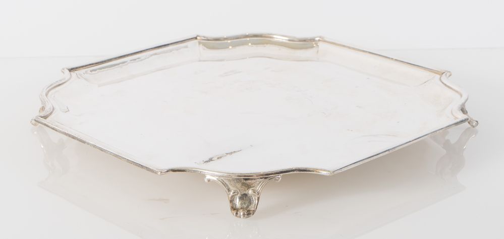 ROSSI & ARCANDI S. n. c., Vicenza, dal 1968. Vassoio polilobato in argento 800. Sul bordo inferiore reca punzoni: losanga locativa 266VI, 800, battuto a mano, sigla dell'argentiere. Cm 31x31. Peso: 727 gr.