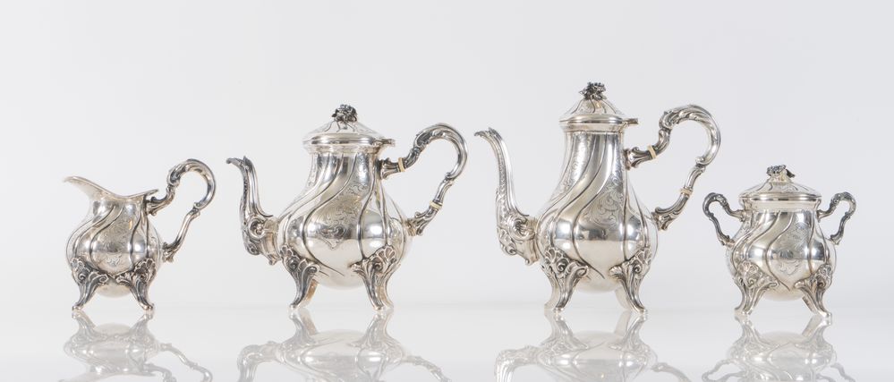 Alessandria, metà del XX secolo. Servizio in argento 800 composto da quattro elementi: caffettiera, lattiera, lattiera e zuccheriera. Sotto la base recano punzoni: 800 e losanga locativa alessandrina. Caffettiera: cm 19x20x10; Teiera: cm 17x20x11; Lattiera: cm 12x8,5x12; Zuccheriera: cm 12,5x12x7,5. Peso complessivo:1.566 gr.