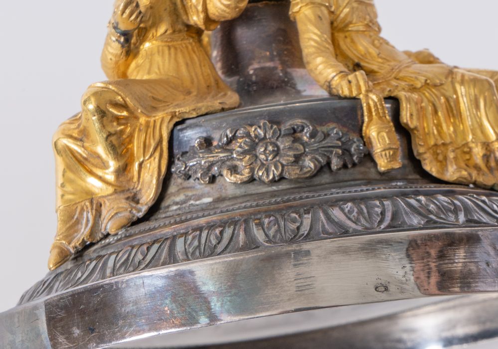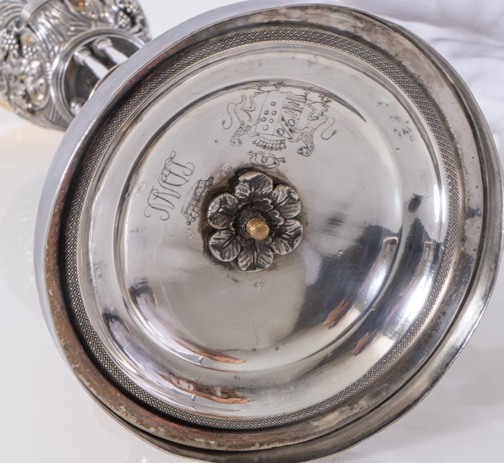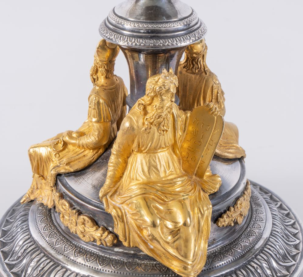 Germania-Austria, fine del XIX secolo. Calice in argento e metallo dorato. Sul calice superiore reca due punzoni: uno parzialmente visibile e chiavi di San Pietro. Sul bordo inferiore reca punzone non identificato. Sotto la base reca stemma nobiliare e sigla. Cm 34,5xdiametro14.Peso complessivo: 1169 gr.