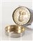 Neresheimer Ludwig & Co, Hanau, inizi del XX secolo. Scatola in argento 835, riccamente decorata. Sul coperchio reca punzoni: 835, luna, corona, stemma dell'argentiere. Cm 2,5x Ø 9,5. Peso: 165 gr.