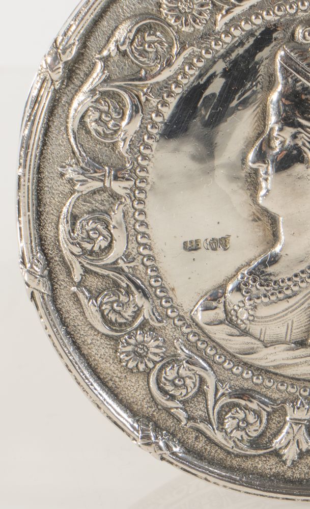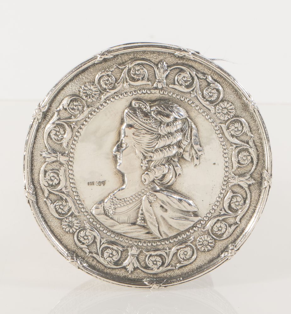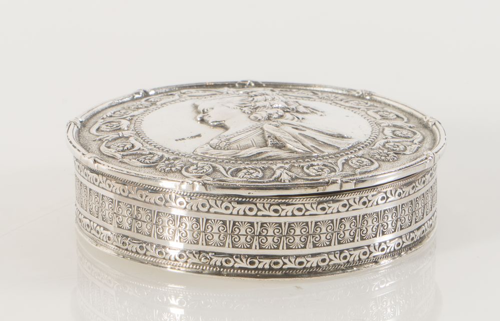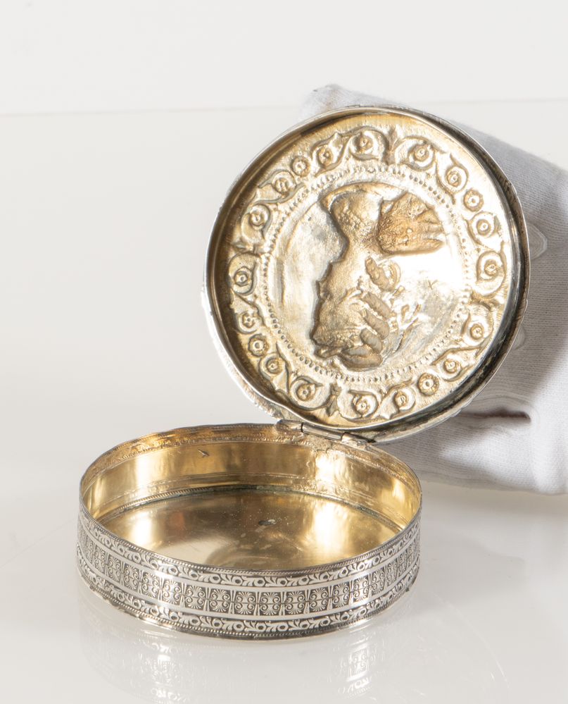 Neresheimer Ludwig & Co, Hanau, inizi del XX secolo. Scatola in argento 835, riccamente decorata. Sul coperchio reca punzoni: 835, luna, corona, stemma dell'argentiere. Cm 2,5x Ø 9,5. Peso: 165 gr.
