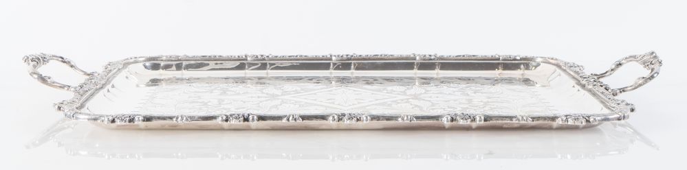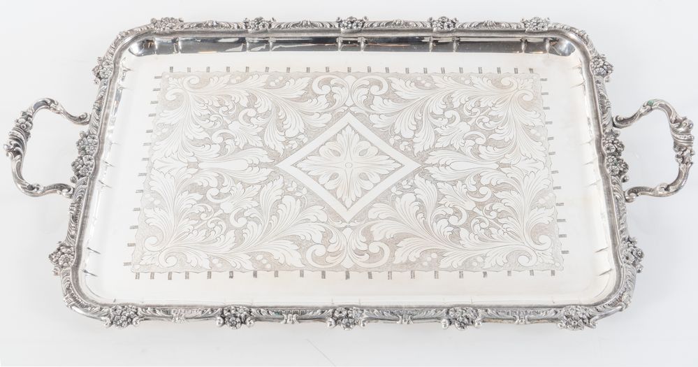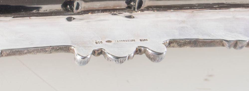 Milano, metà del XX secolo. Vassoio in argento 800, riccamente decorato. Sotto la base reca punzoni: 800, losanga locativa milanese e lavorazione mano. Cm 4,5x61,5x36. Peso: 2418 gr.