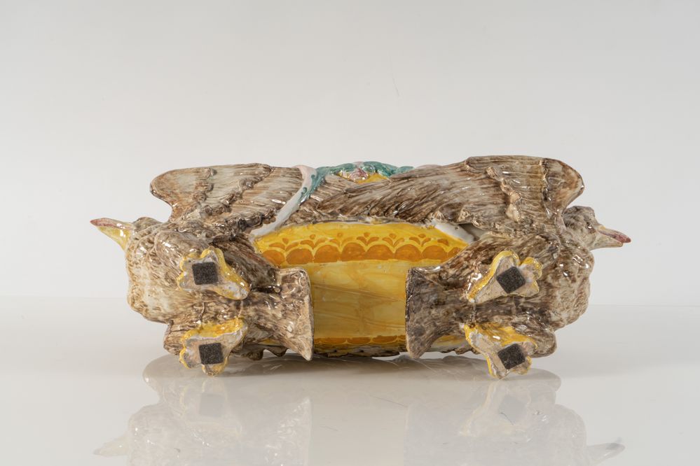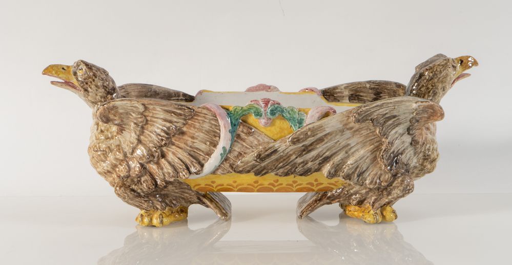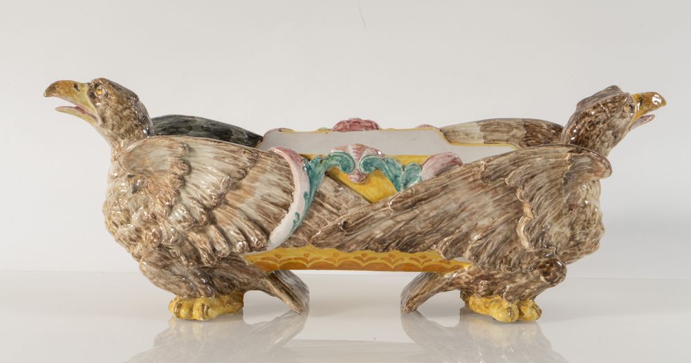 Giardiniera con aquile contrapposte in maiolica policroma. Inizio del XX secolo. Cm 22x55,5x19.