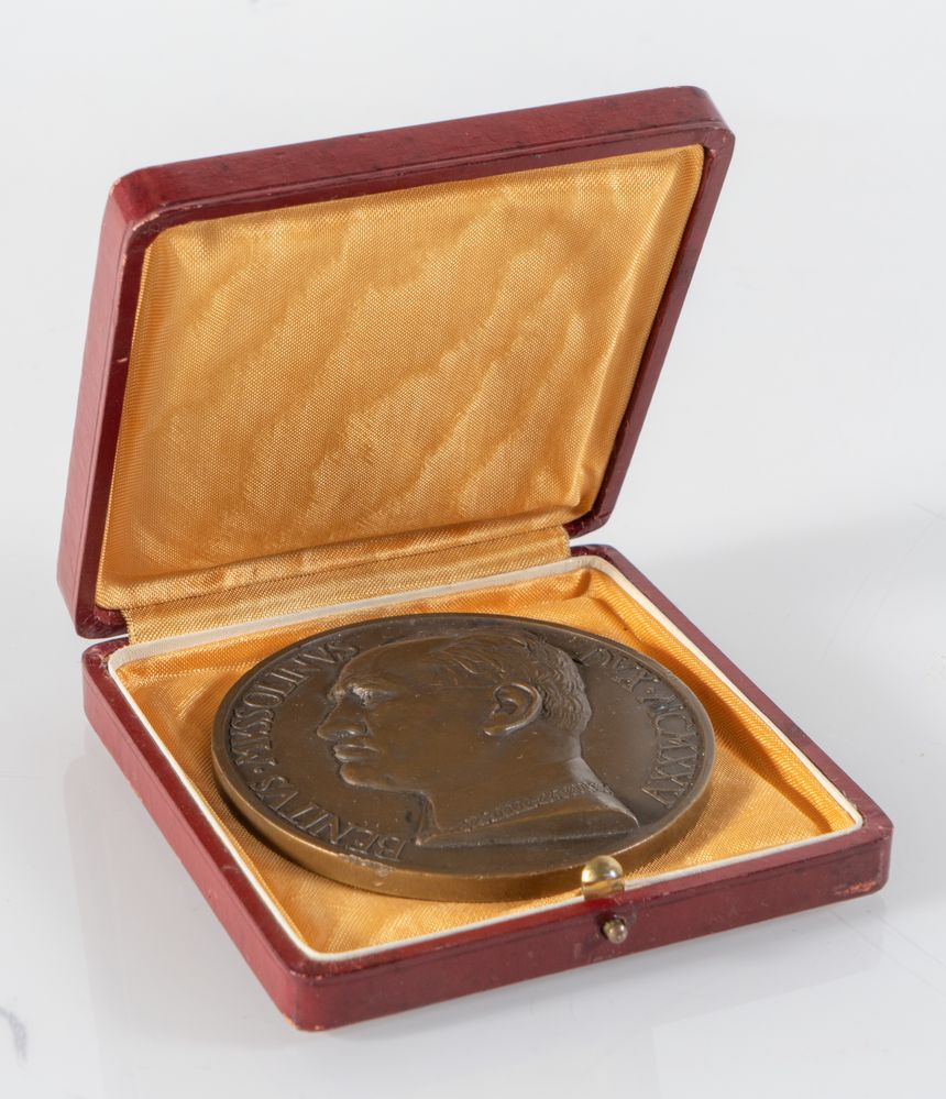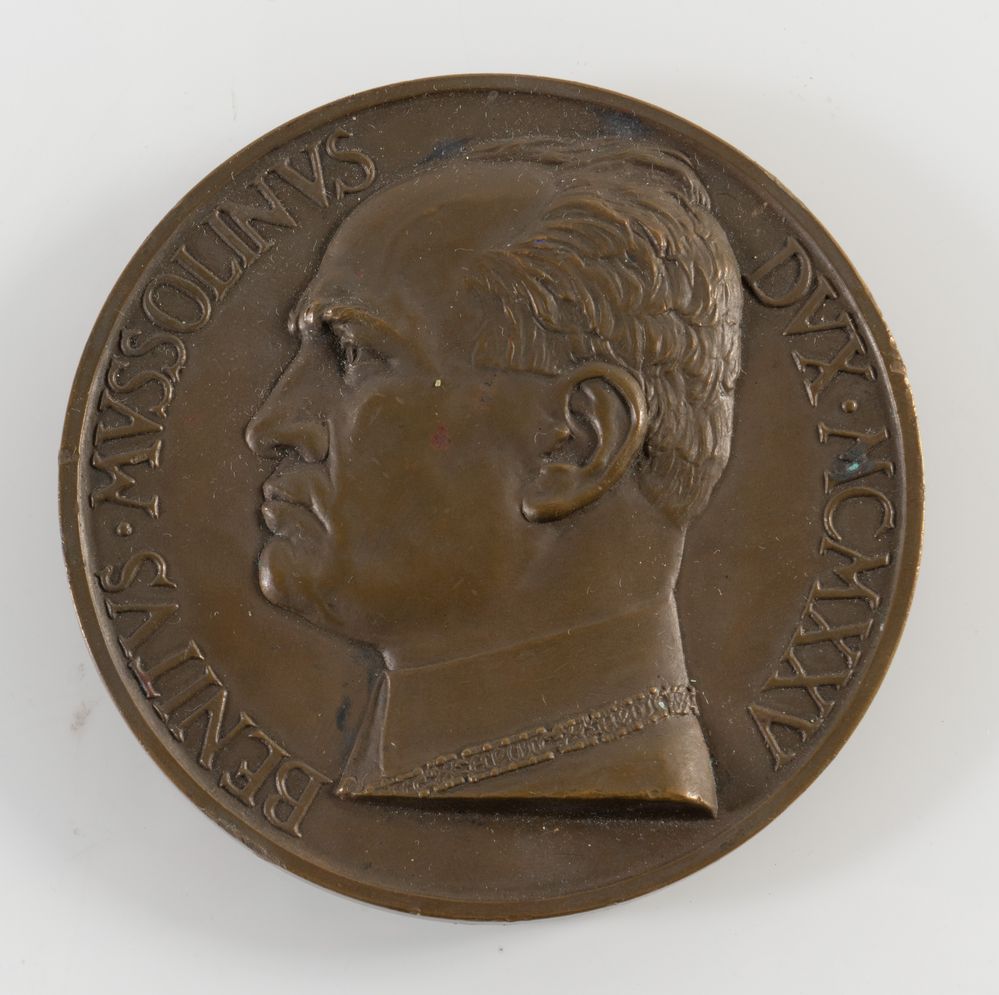 "italiam vehit fortvnamque sva". Medaglia in bronzo, 1925. Un lato reca il profilo di Benito Mussolini con scritta BENITVS MVSSOLINVS DVX MCMXXV, l'altro lato reca figura maschile che regge timone, con scritta ITALIAM VEHIT FORTVNAMQVE SVAM e Mistrvtii opus. Ø cm 8.