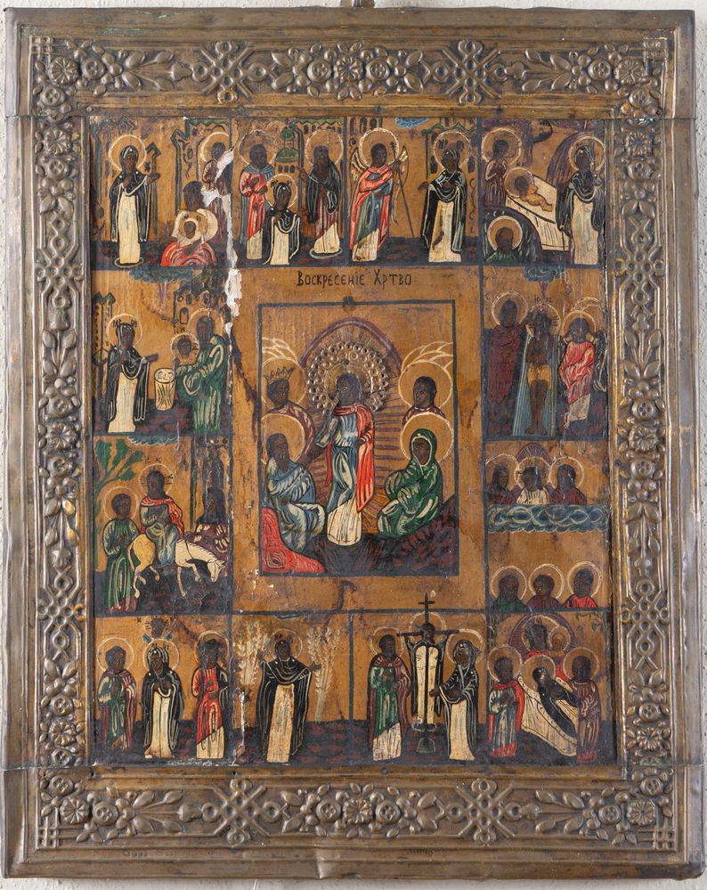 Maestro della metà del XIX secolo. Icona con scene della vita di Cristo, con parti della cornice in rilievo sbalzato. Cm 45,5x36,5.