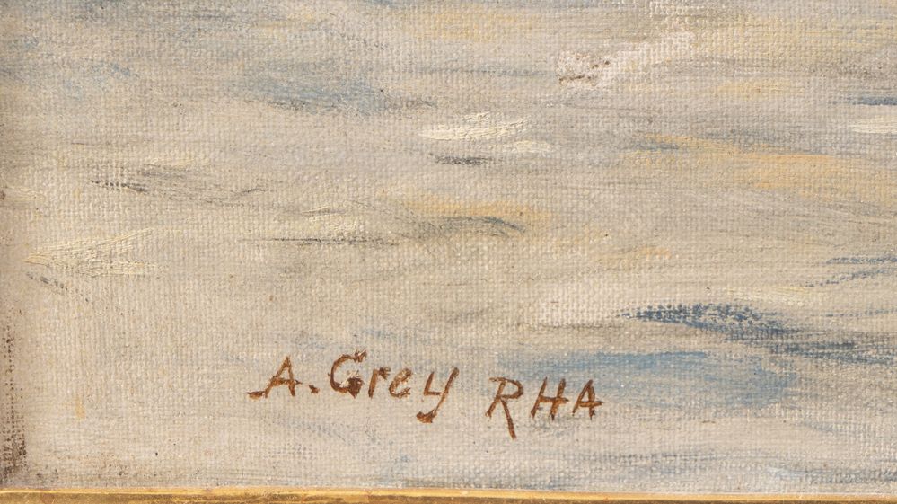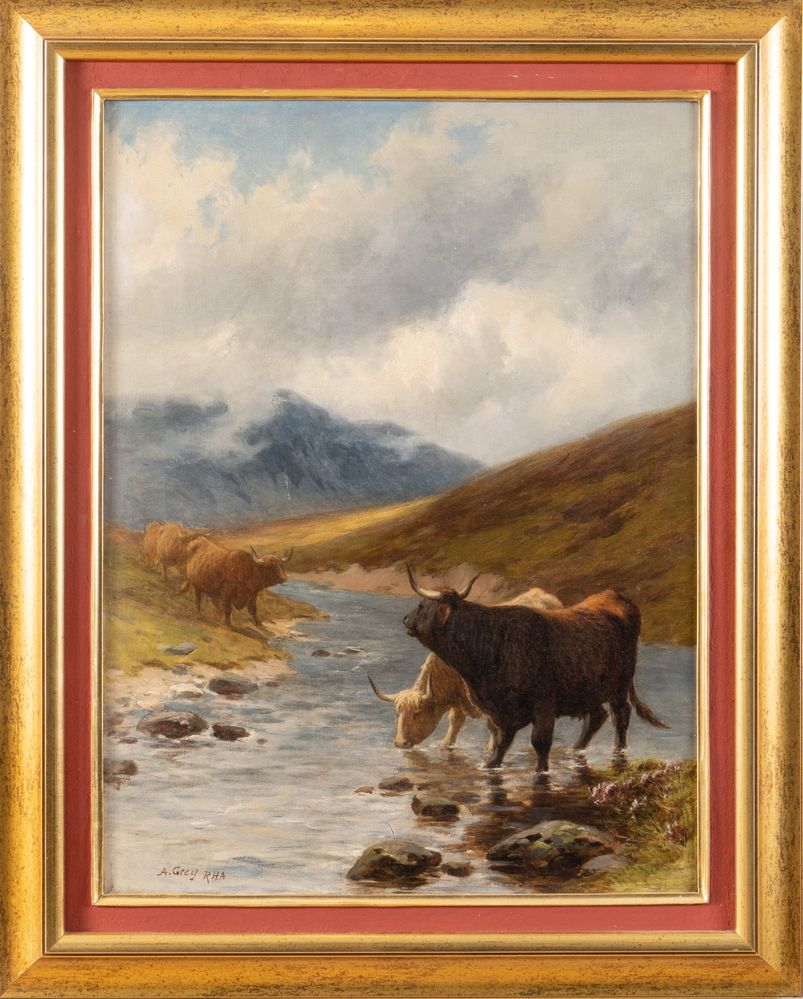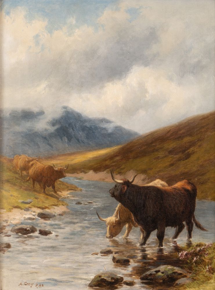 ALFRED GREY (Irlanda 1845 - 1926) "Mucche al pascolo". Olio su tela. Cm 60x45. Opera firmata in basso a sinistra A. Grey Rha.