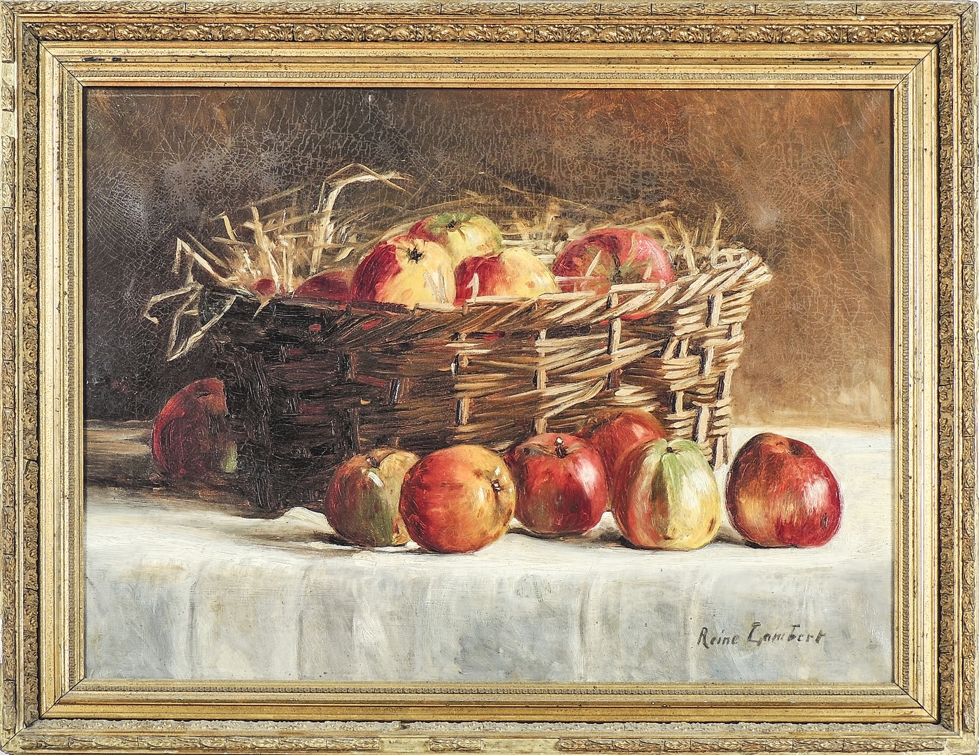 REINE LAMBERT Natura morta con cesto di frutta olio su tela, firmato, in cornice coeva, difetti cm 50x65