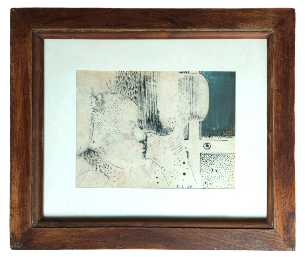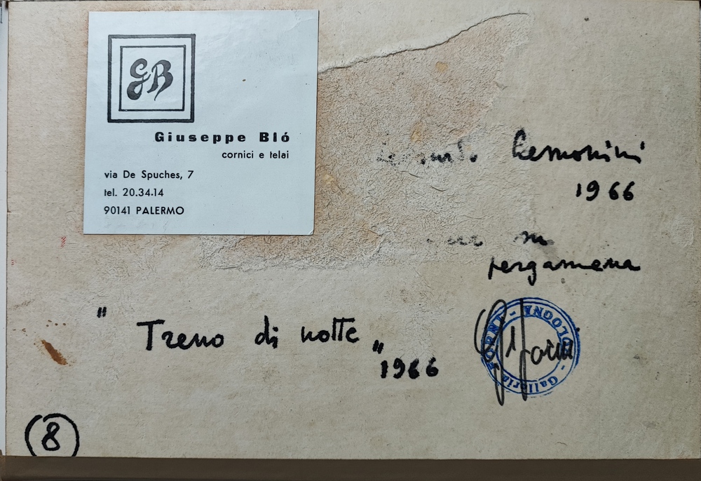 Tecnica mista su pergamena applicata su cartone pressato 20x15 cm; firma e anno in basso a destra, firma, titolo e anno al retro.