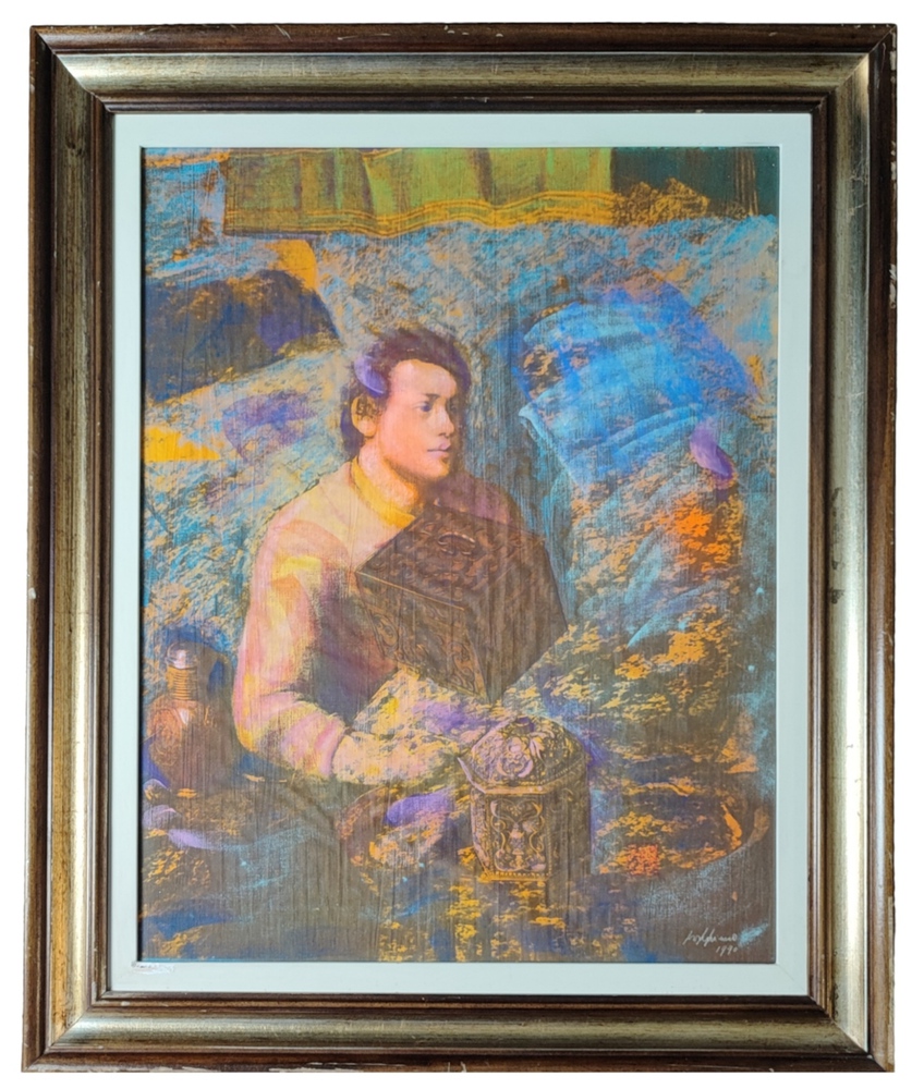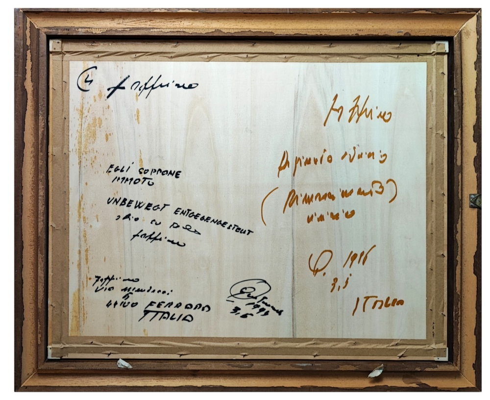 Olio su tavola 50x70 cm; firma e anno in basso a destra, firma e scritture dell'artista retro.