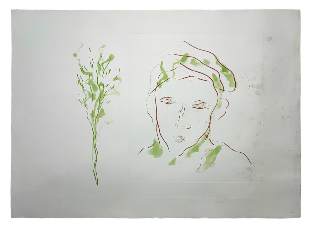 Treccani Ernesto ( 1920 - 2009 ) COMPOSIZIONE CON VOLTO Doppia incisione all'acquatinta 50x70 cm Esemplare 77/90 in basso a sinistra, firma in basso a destra, tracce di Foxing.