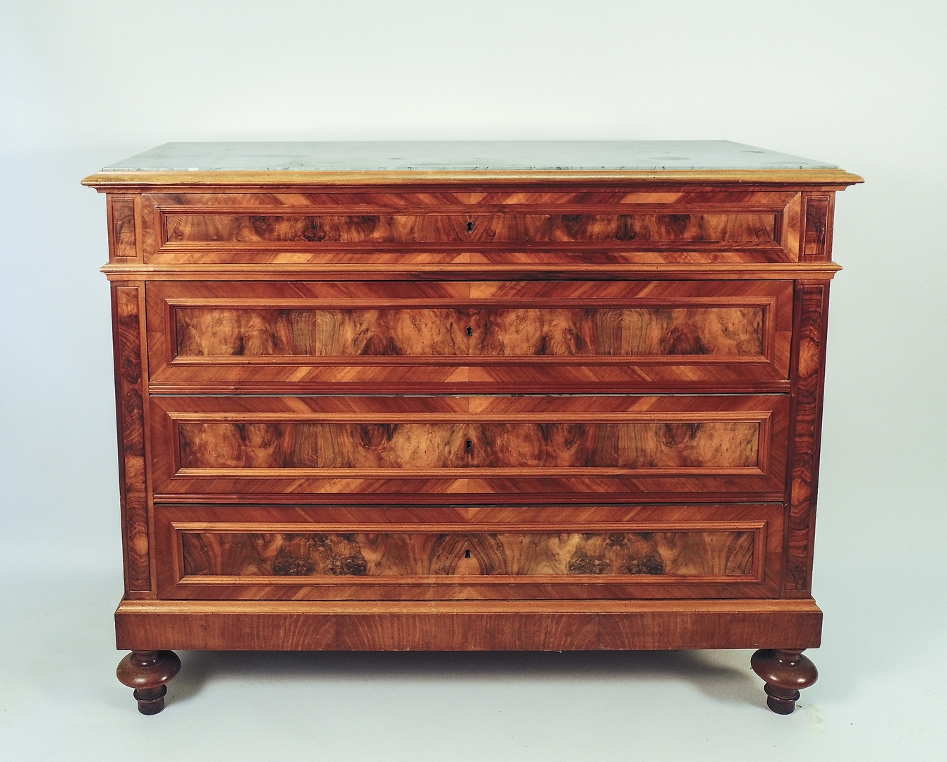 COPPIA DI CASSETTONI IMPIALLACCIATI IN PIUMA E RADICA DI NOCE fine del XIX secolo piano in marmo grigio incassato, quattro cassetti sul fronte dritto decorati da cornici modanate, piedi a cipolla h cm 109x132x60