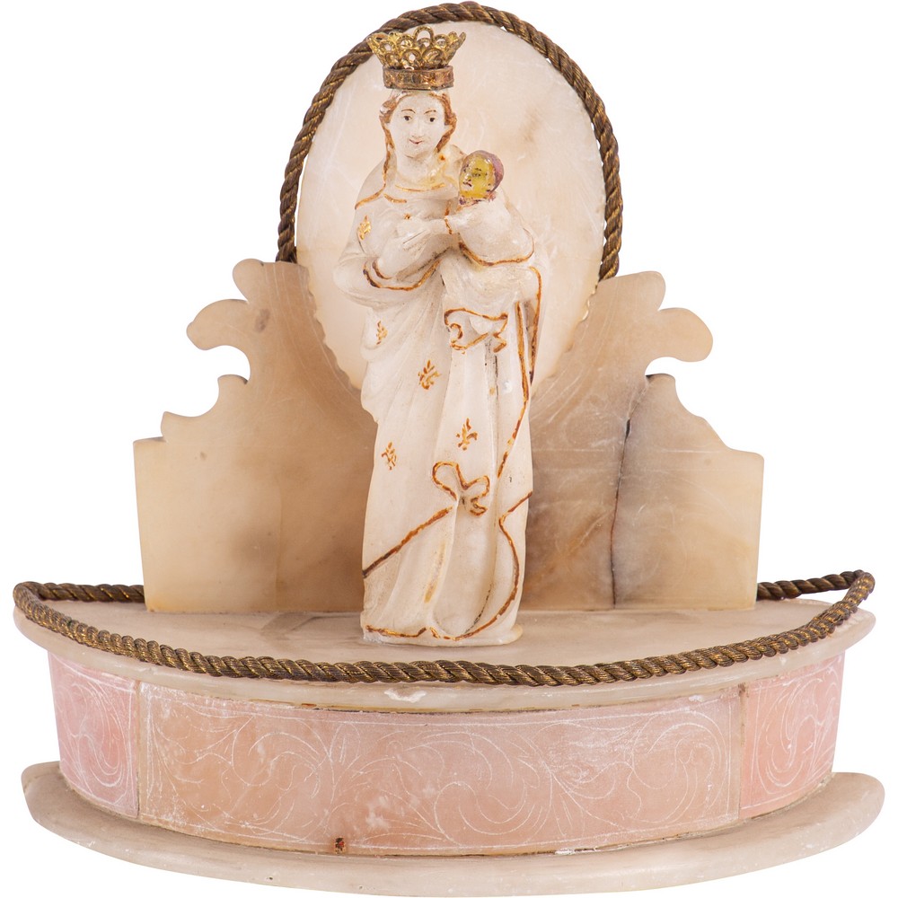 Scultura in alabastro raffigurante "Madonna con bambino" con base (difetti).