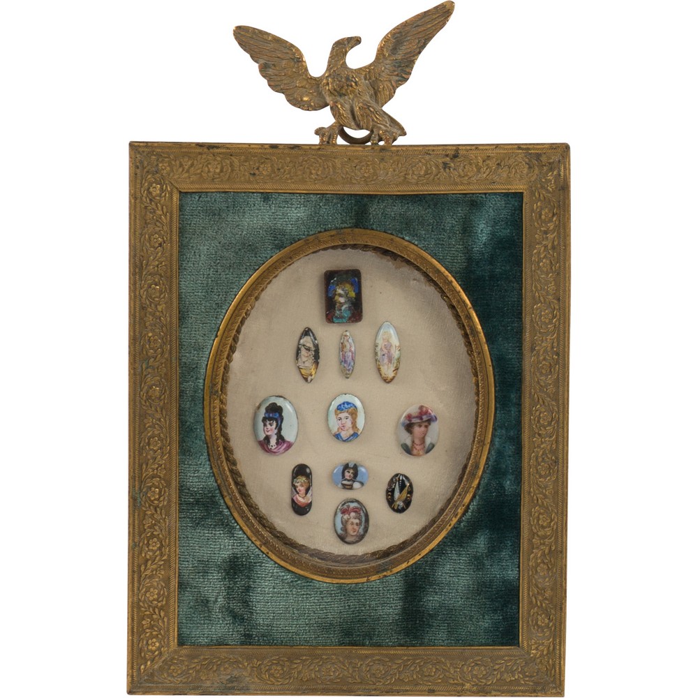 PICCOLA CORNICE stile impero con medaglione ovale in metallo, contenente sei miniature in porcellana smaltata raffiguranti "Volti di donne".