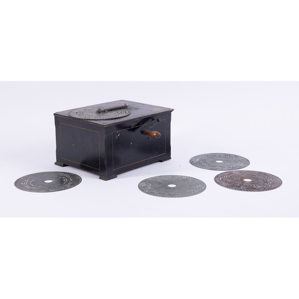 SCATOLA MUSICALE a manovella in legno ebanizzato e 5 dischi.