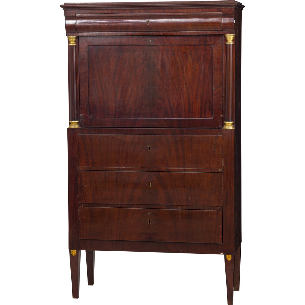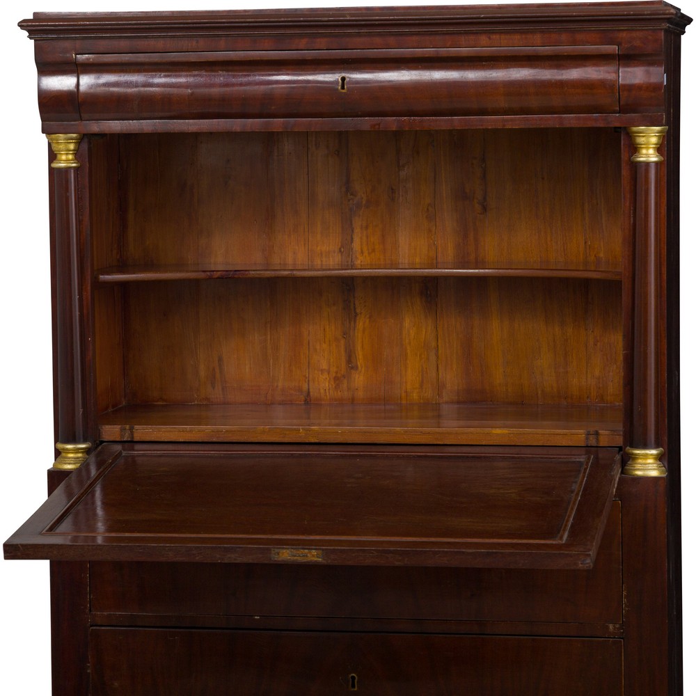 SECRETAIRE Tardo Impero in legno di mogano e piuma di mogano con mezzi capitelli in legno dorato, quattro cassetti e ribalta.