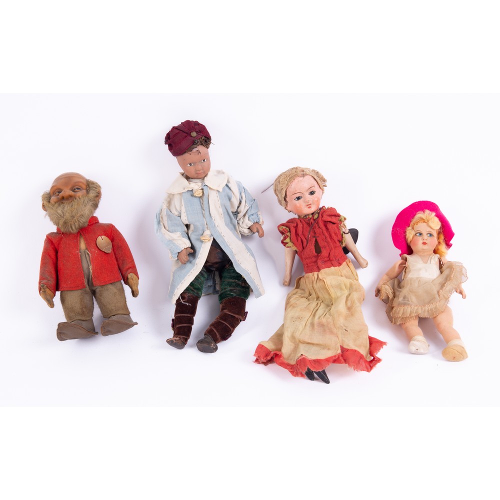 ELFO in celluloide e TRE BAMBOLINE in porcellana Biscuit e stoffa.