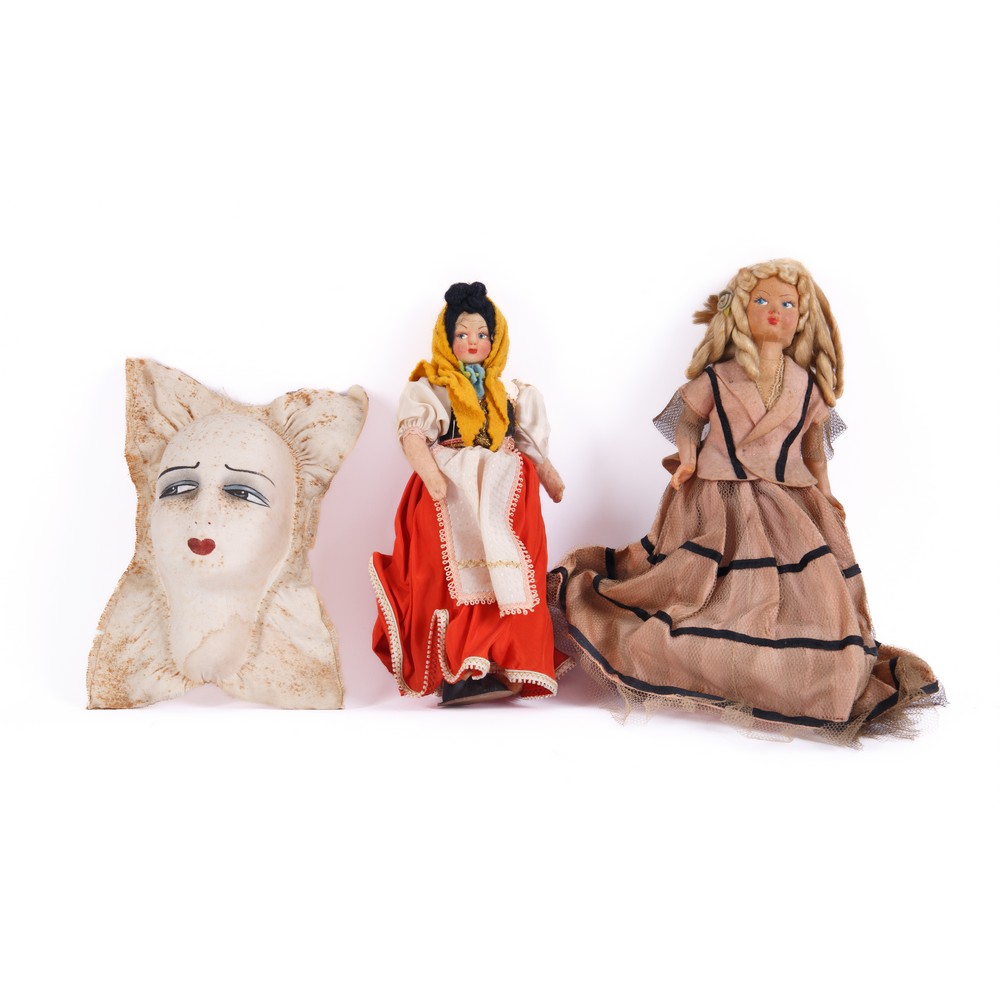MASCHERA E DUE BAMBOLE di pezza e celluloide.