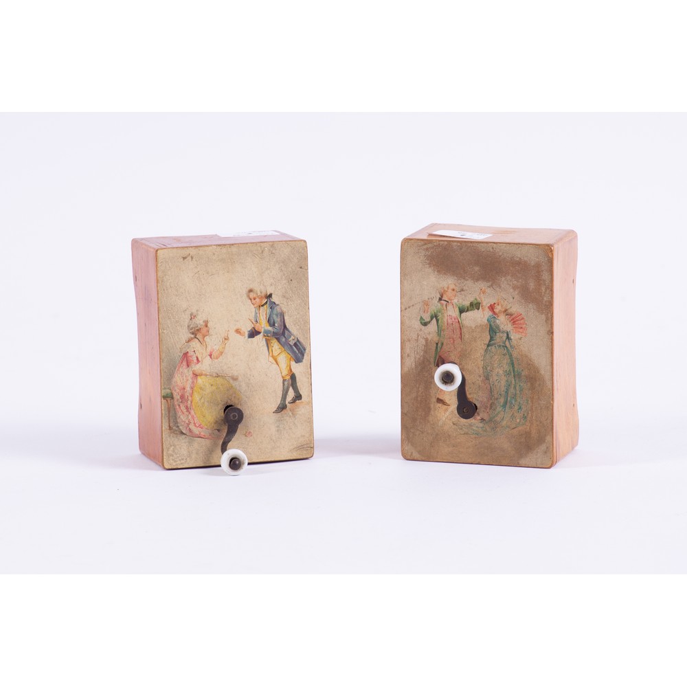 DUE SCATOLE CARILLON in legno con stampe raffiguranti "Scene galanti".