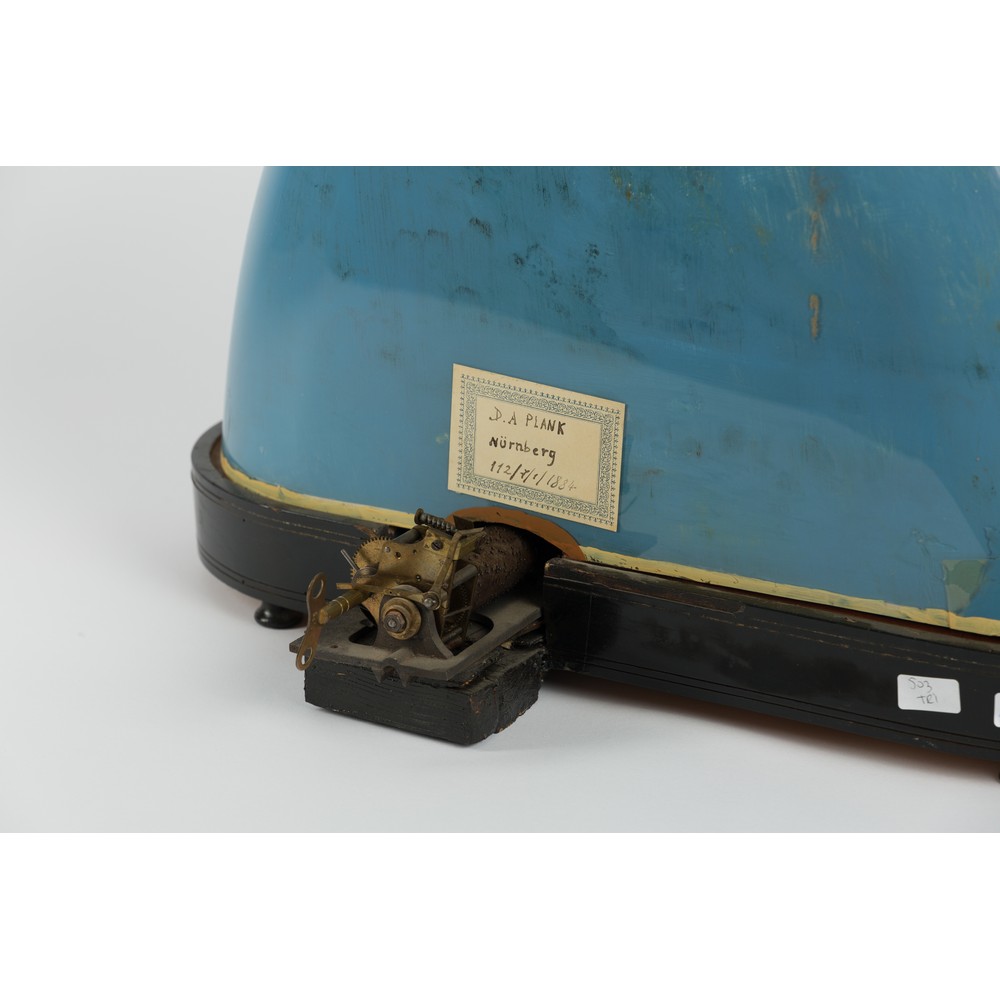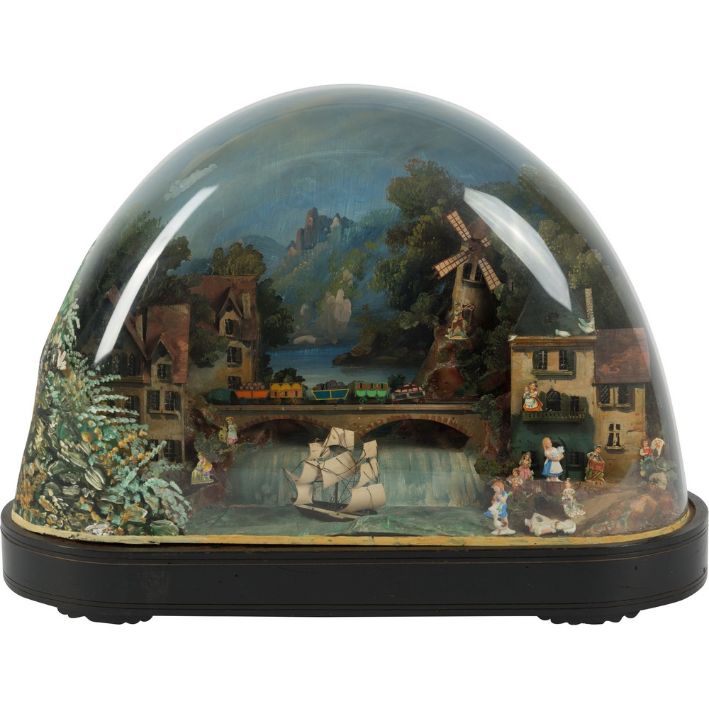AUTOMA con carillon, raffigurante "Scena di mare con una barca in movimento" entro globo in vetro dipinto e base in legno ebanizzata.