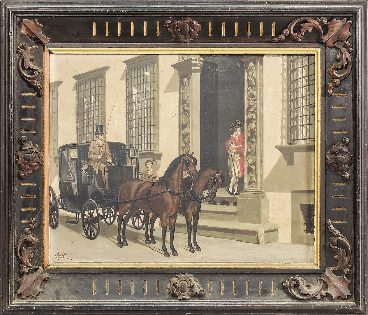 SCUOLA TOSCANA DELL'INIZIO DEL XX SECOLO Carrozza in attesa davanti ad un nobile palazzo lucchese olio su tavoletta, firmato A. Morelli, in cornice coeva in legno ebanizzato cm 39x49 Al verso reca sigla intagliata nella tavoletta