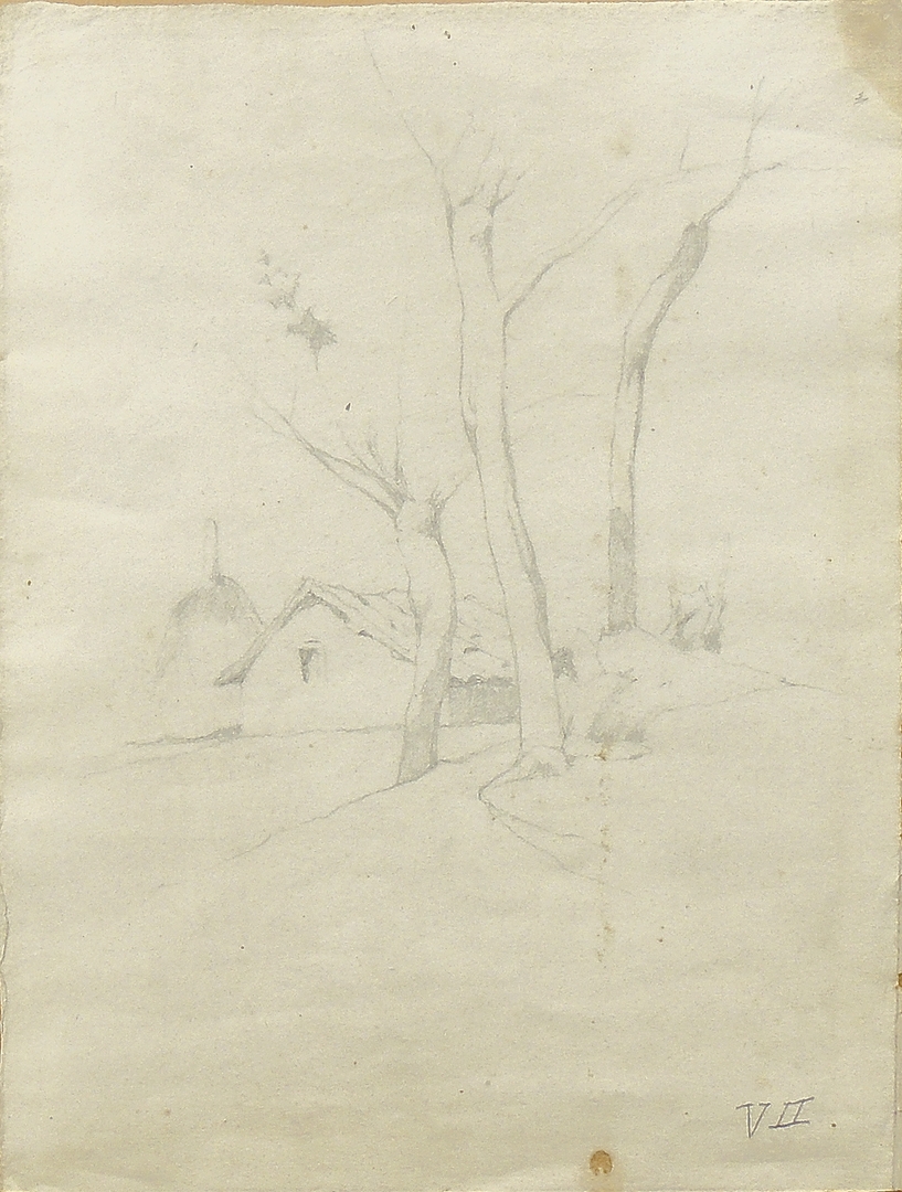 GIOVANNI FATTORI (1825-1908) Veduta di casolare con alberi e pagliaio matita su carta cm 31x22,6 In basso a destra reca numerazione a matita ''VII''. Al verso del cartoncino di supporto reca timbro ovale "Collezione Malesci".