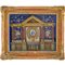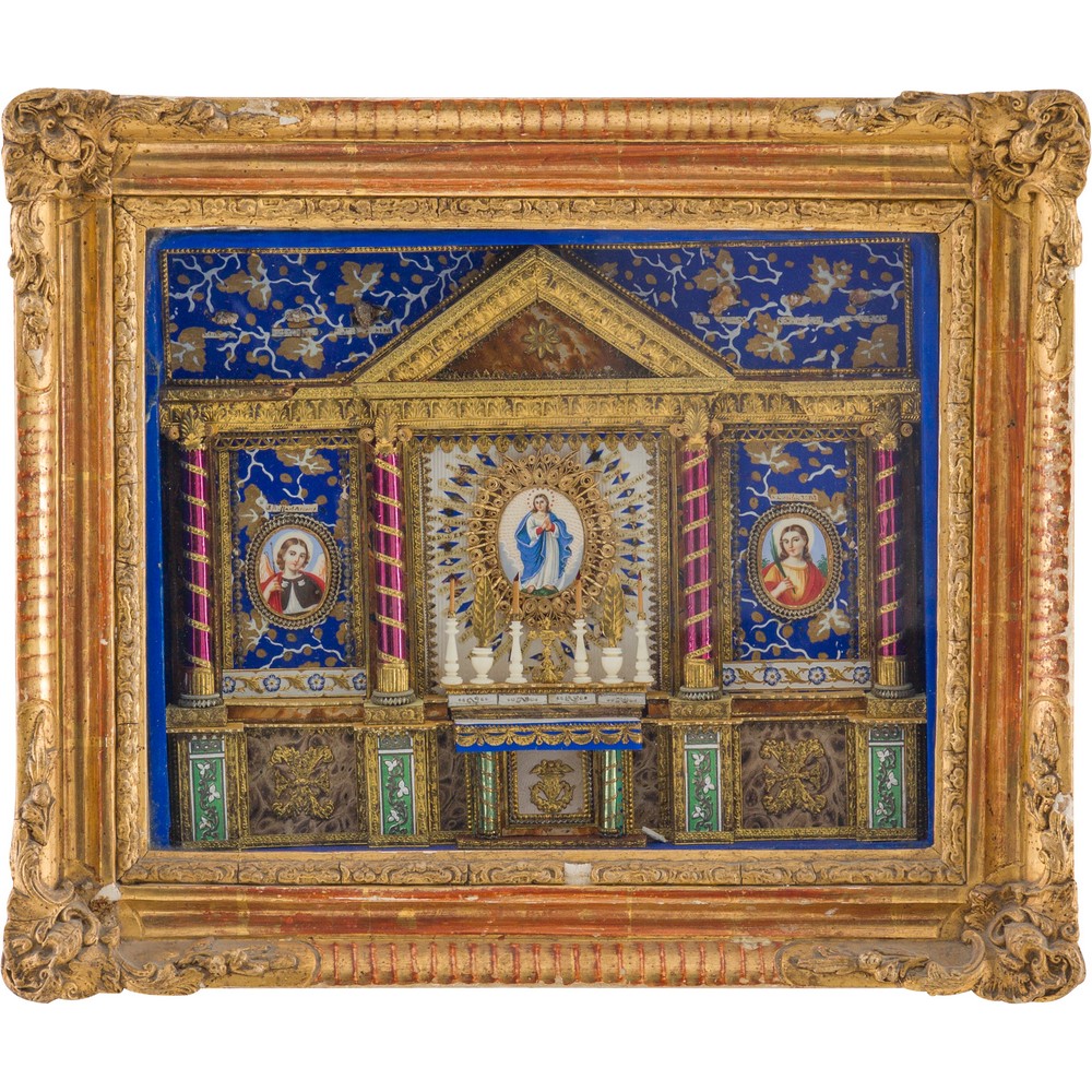 EDICOLA VOTIVA con altare in lamina di ottone dorato, candelieri in osso e tre miniature dipinte a mano su osso, pietre dure, entro teca in legno dorato.