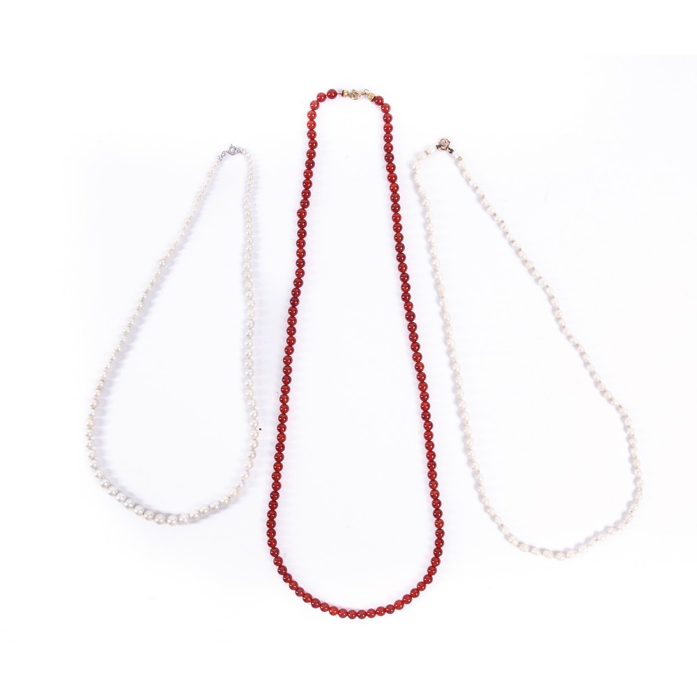 Collana con perline, chiusura in oro 18 KT, collana con perline, chiusura in oro 9 KT, collana in corniola, chiusura in oro 18 KT.