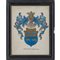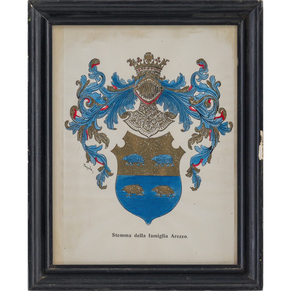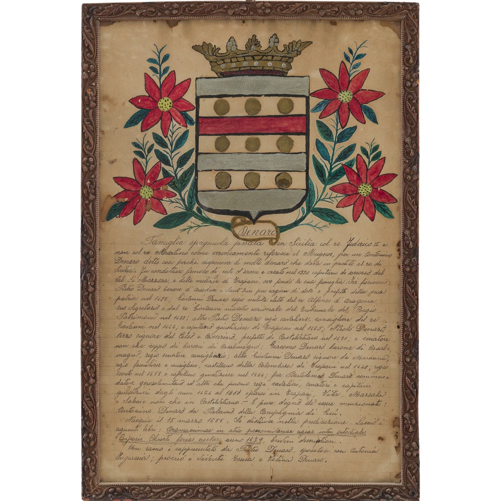 Stampa acquarellata "Stemma Famiglia Arezzo" e tecnica mista "Stemma Famiglia Denaro", con descrizione a mano dei passaggi di famiglia.