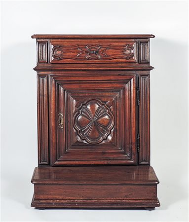 INGINOCCHIATOIO IN NOCE Italia settentrionale, fine del XVIII secolo fronte ad un cassetto e uno sportello con formelle sagomate, piedini a palla schiacciata h cm 90x70x49