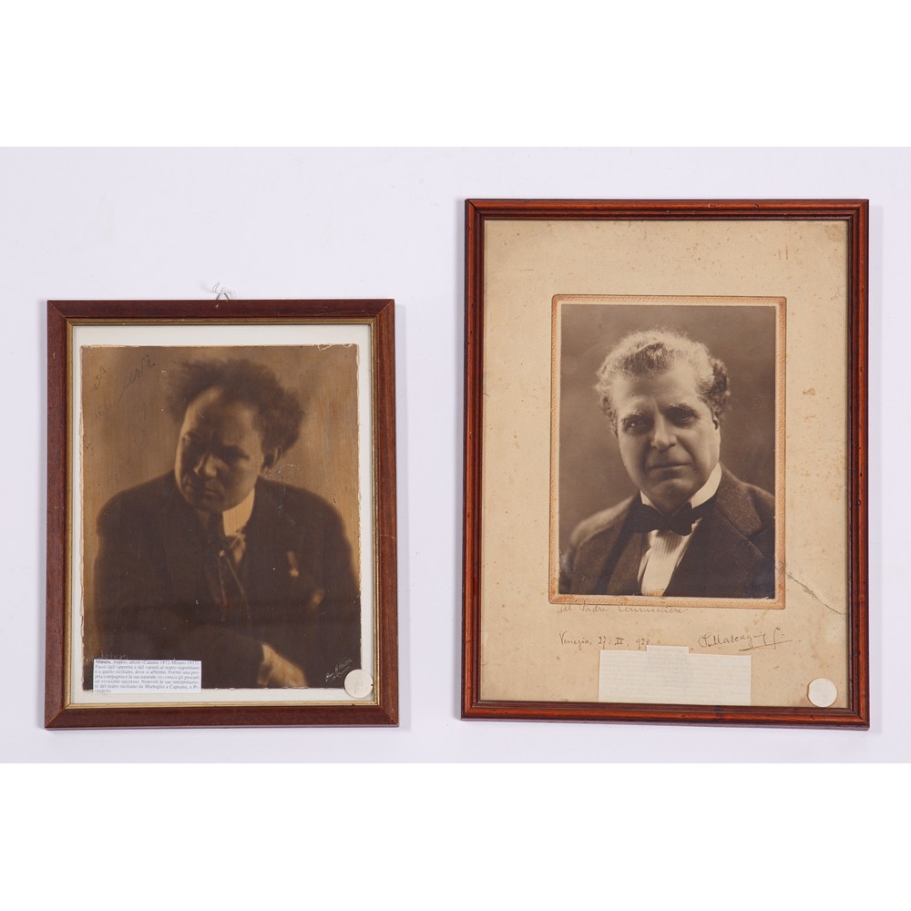 DUE FOTOGRAFIE IN CORNICE DI ANGELO MUSCO, una di cm 21, 5 x 27, datata Bologna 13 Maggio 1924 e realizzata dallo studio Villoresi; l’altra di cm 22,5 x 17, datata Venezia 27 Febbraio 1928 e realizzata dallo studio Giacomella.