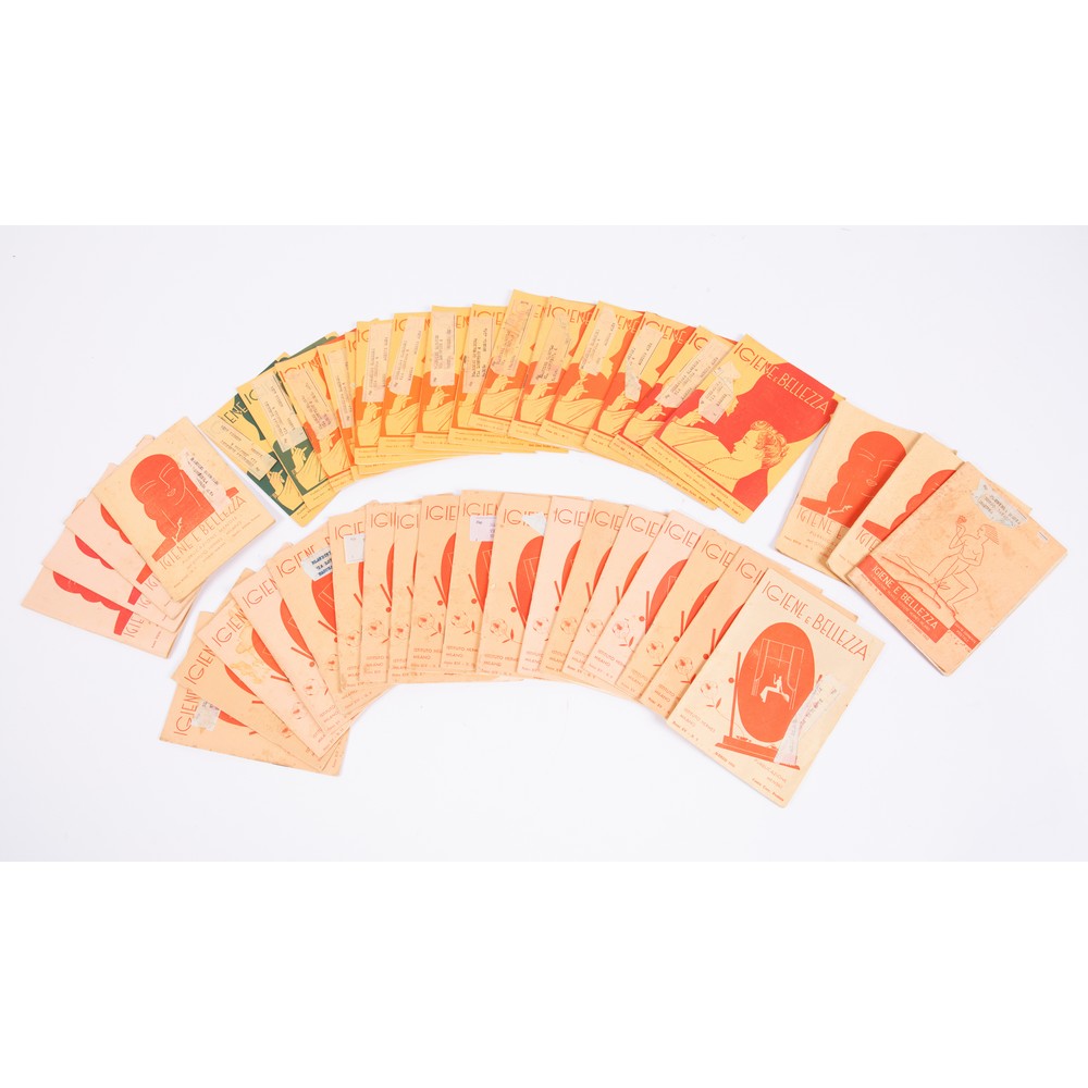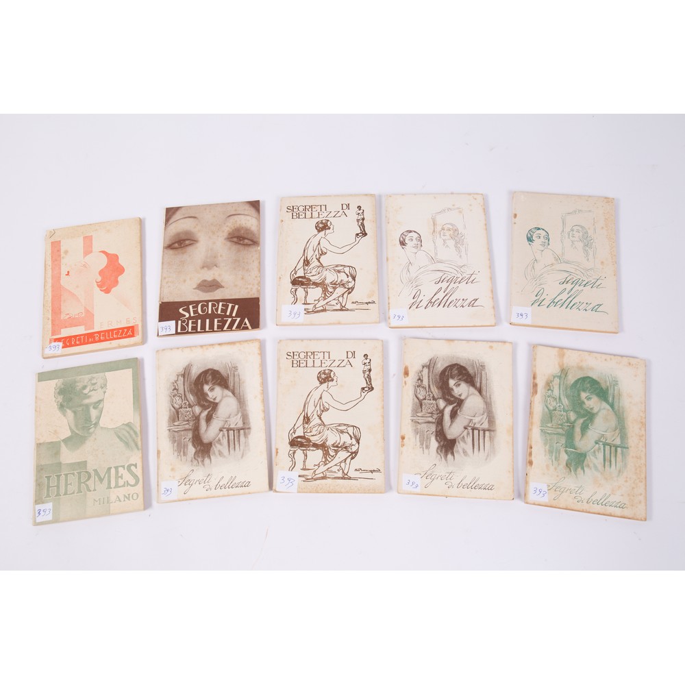 QUARANTA OPUSCOLI DELLA HERMES, di cui 25 della serie “Igiene e bellezza”, periodo 1932 – 1942 e 10 della serie “Segreti e bellezza”, periodo 1926 -1936. Gli opuscoletti di dimensione cm 17 x 12, erano pubblicazioni mensili. Brossure editoriali originali a colori.