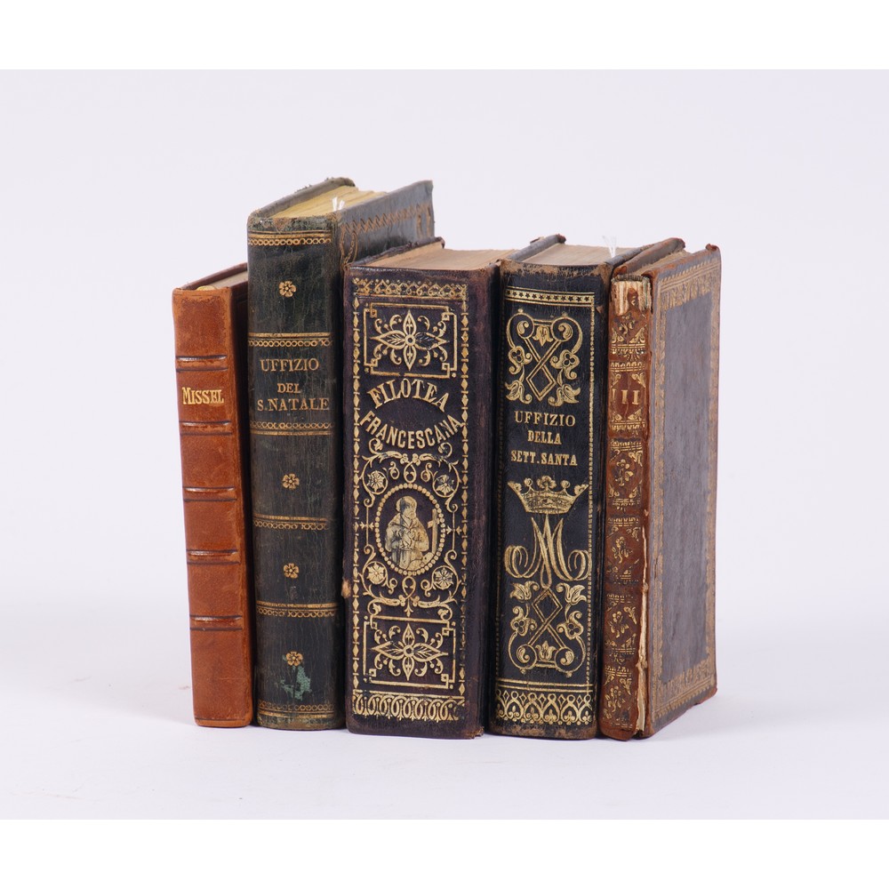 CINQUE VOLUMETTI DI RELIGIONE IN 16°: 1) P. Felice da Bergamo FILOTEA FRANCESCANA OSSIA MANUALE DI PIETA’, ed. Annali Francescani, Milano 1898. Bella legatura editoriale con titoli e fregi impressi in oro al dorso. Piatti impressi a secco. Pp. 920. 2) Monsignor Martini UFFIZIO DELLA SETTIMANA SANTA, ed. Milano, Bontà e C. 1872. Bella legatura editoriale con titoli e fregi impressi in oro al dorso. Piatti impressi a secco. Tagli dorati. Pp. 640. 3) Michele Basilio Clari UFFIZIO ED I VESPERI RESPETTIVI ALLE TRE MESSE DELLA NATIVITA’ DI NOSTRO SIGNORE, ed. Foligno, Tipografia Tomasini 1836. Legatura in piena pelle con cornice dorata ai piatti e tioli e fregi in oro al dorso. Tagli colorati. Pp. 359. 4) MISSEL ROMAINE, ed. Tours Maison Alfred Mame et Fils 1926. Bella legatura in piena pelle impressa a caldo raffigurante Crocifisso. Nervature ai dorsi con breve titolo in oro. Tagli dorati. Stampato su carta velina. Belle tavole f. t. protette da velina. Pp. 512.5) UFFIZIO DELLA B. V. MARIA DOPO L’AVVENTO, ed. In Roma MDCCLXV, Presso Gioacchino e Giuseppe Salvioni Stampatori Vaticani. Bella legatura in piena pelle muta con cornice floreale in oro ai piatti e fregi floreali in oro al dorso. Tagli dorati. Xilografia della Sacra Famiglia in antiporta e Xilografia della Madonna con Bambino al frontespizio. Pp. 364. Tutti i volumi sopra descritti sono in ottime condizioni.