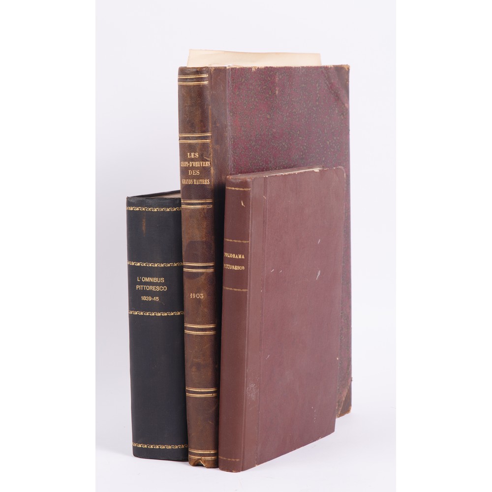 TRE VOLUMI DI PERIODICI RILEGATI: 1) POLIORAMA PITTORESCO, Anno Terzo - Semestre Primo dal 20 Agosto 1838 al 20 Febbraio 1839 e Anno Terzo – Semestre Secondo dal 10 Febbraio al 16 Agosto 1839, Dalla Tipografia e Litografia del Poliorama Pittoresco. In 4°. Pp. 411 (1) continuative. 2) L’OMNIBUS PITTORESCO, anni 1939 – 1945. Rilegatura in mezza tela con angoli e cartonato rigido. In 8° grande. Con centinaia di belle calcografie nel testo. Circa 200 pagine ad annualità. 3) LES CHEFS D’OEUVRE DES GRANDS MAITRES, Paris, Hachette 1903. In folio. 15 fascicoli in brossura. 60 tavole di eccezionali riproduzioni d’opere di grandi maestri. Le tavole sono protette da velina esplicativa con dettagliate descrizioni dell’opera. Legatura in mezza pelle con angoli e piatti marmorizzati. Tavole in perfetto stato di conservazione.