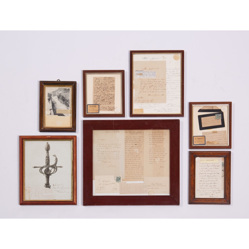 OTTO AUTOGRAFI DI SICILIANI ILLUSTRI del XIX e XX secolo, in cornice novecentesca: 1) Lettera autografa di Mario Rapisardi, data 8 Luglio 1901, con relativa busta di spedizione postale.2) Bozzetto di un’elsa cesellata con dedica autografa di Mario Rutelli. S. d. 3) Due lettere autografe dell’Abate Benedetto Gravina, l’una del 1 Gennaio 1872 e l’altra del 20 Marzo 1873.4) Biglietto a firma di Giovanni Verga al Barone di Policastro datato 15 Ottobre 1903 con relativa busta originale. 5) Cartolina di G. Antonio Borgese alla sorella, datata 8 Luglio 1905. 6) Lettera di Giuseppe Pitrè al Prof. L. Di Giovanni datata 30 Aprile 1898. 7) Lettere autografe e biglietto da visita con ringraziamenti di Luigi Capuana, con busta di spedizione del biglietto da visita.
