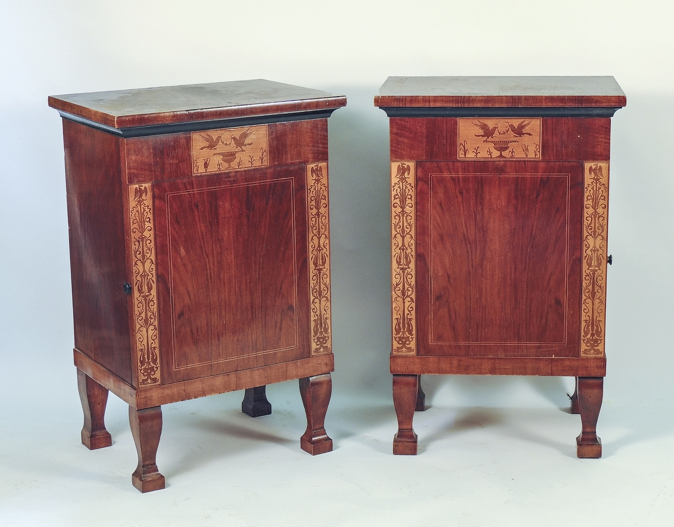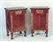 COPPIA DI COMODINI IMPIALLACCIATI IN PIUMA DI NOCE inizio del XX secolo intarsiati in legni di frutto a raffaellesche, uno sportello sul fronte dritto, piedi sagomati, en pendant con il lotto precedente h cm 87x56x42