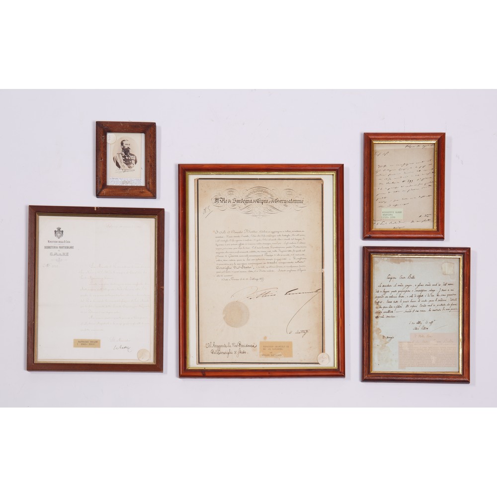 CINQUE AUTOGRAFI DI PERSONAGGI RISORGIMENTALI in cornice novecentesca: 1) Lettera di Silvio Pellico indirizzata al conte Cesare Balbo. Riporta la data del 2 Maggio ma senza anno. 2) Lettera a firma di Vittorio Emanuele II ed Urbano Rattazzi datata Torino 11 Febbraio 1855.3) fotografia con autografo del Generale Alberto Ferrero La Marmora ( fratello di Alfonso, Carlo Alberto e Alessandro, anch’essi generali sabaudi come lui) s.d.4) Lettera a firma di Marco Minghetti datata Bologna 17 Agosto 1871. 5) Lettera a firma di Urbano Rattazzi iuniore (nipote dell’omonimo uomo politico) datata Palermo 18 Novembre 1881.