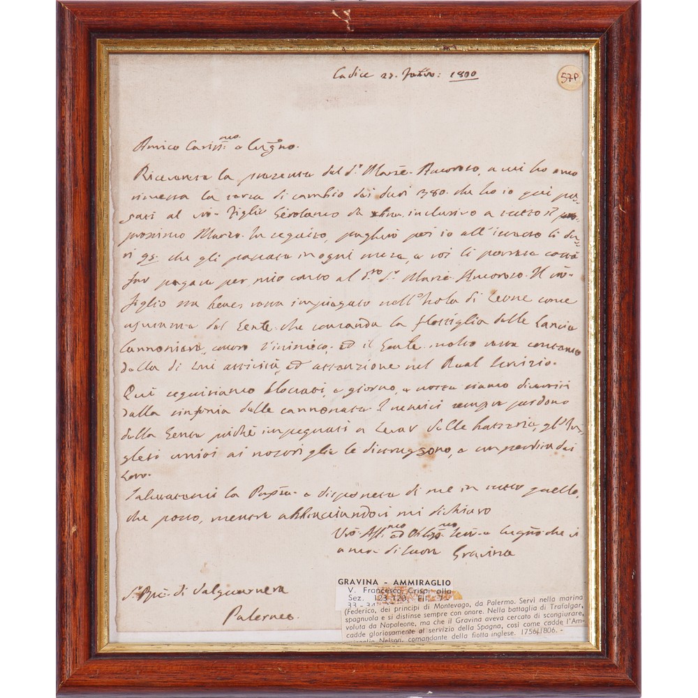 LETTERA AUTOGRAFA DELL’ AMMIRAGLIO GRAVINA, in cornice novecentesca. Si tratta di una rara lettera del Gravina, datata Cadice 27 Marzo 1800. Federico Carlo Gravina, dei Principi di Montevago, meglio noto come Ammiraglio Gravina, fu un militare e diplomatico al servizio della Spagna. Amico personale di Napoleone, e membro di fiducia della corte del Re Carlo IV, dopo una brillante carriera come ufficiale di Marina e Diplomatico della Corte di Spagna, combatté coraggiosamente nella battaglia di Trafalgar, al comando di una squadra della flotta spagnola; a seguito delle ferite ivi riportate morì il 2 Marzo 1806. Le sue spoglie riposano a Cadice nella chiesa di S. Fernando.