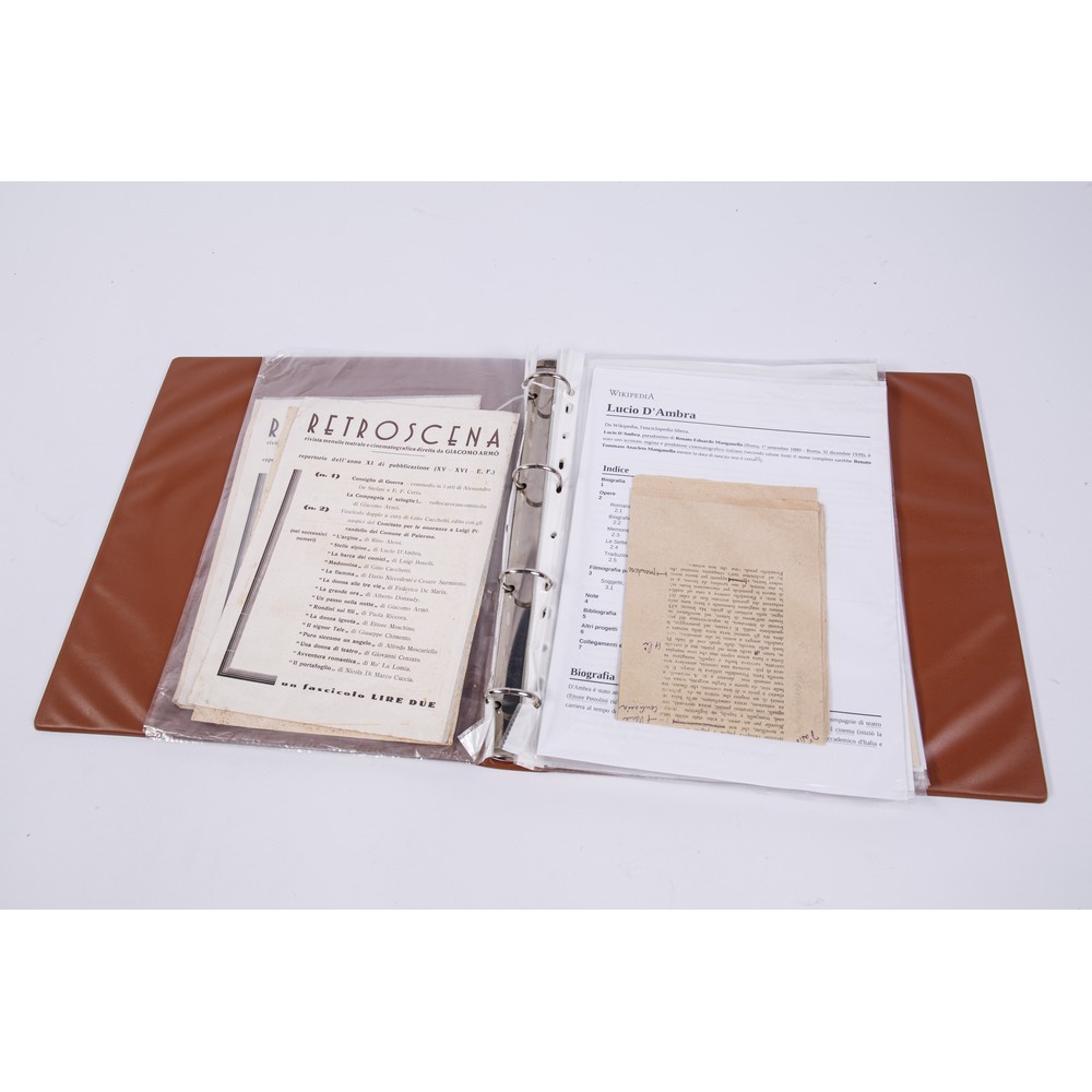 RACCOGLITORE CONTENENTE RICORDI E OMAGGI LETTERARI A LUIGI PIRANDELLO. Il raccoglitore contiene due locandine pubblicitarie della rivista Retroscena di Giacomo Armò, relative ai fascicoli pubblicati per le commemorazioni di Luigi Pirandello nella città di Palermo; un articolo commemorativo dattiloscritto di Lucio D’Ambra (scrittore, regista e produttore cinematografico) da lui corretto e postillato; una poesia dedicata a Pirandello di Paolo Nuzzi (regista e sceneggiatore); un racconto dattiloscritto e firmato di Libero Bovio (poeta. Scrittore, drammaturgo e giornalista, nonché uno dei massimi artefici della canzone napoletana); un articolo dattiloscritto, corretto, postillato e firmato da Cesare Vico Lodovici (commediografo, scrittore e traduttore italiano); una busta spedita e affrancata dell’editore Casella di Napoli contenente una fotocartolina di Luigi Pirandello; un dattiloscritto anonimo contenente appunti sulla vita di Pirandello; sette fotografie, entro custodia dello studio fotografico White di Capri, in b/n del Caos prima del restauro; la dissertazione inaugurale a stampa dell’anno accademico della Facoltà di Filosofia della Università Federico Guglielmo di Bonn per l’anno 1891 su Luigi Pirandello del famosissimo filologo tedesco Wendelin Foerster.