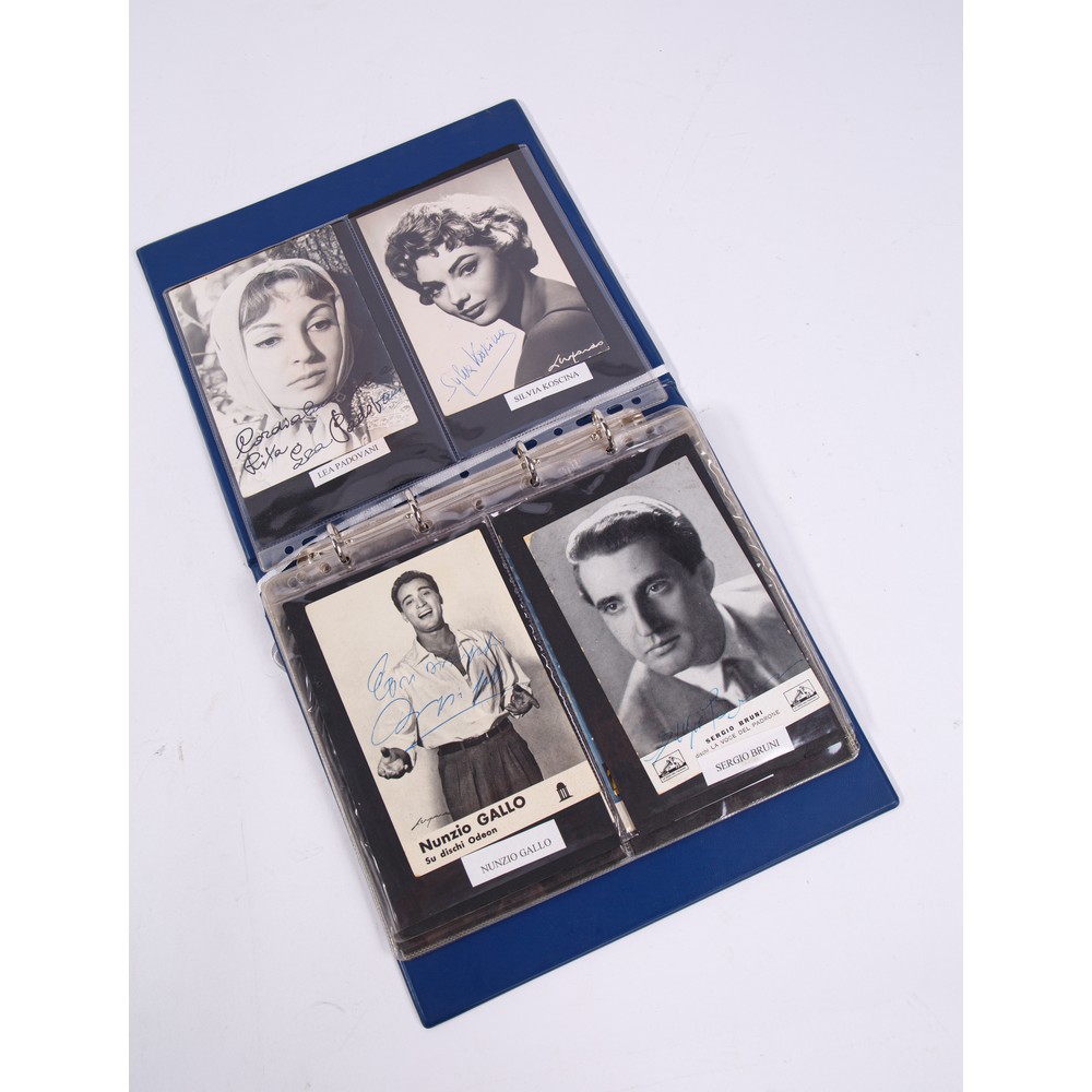 RACCOGLITORE CON 24 FOTOGRAFIE AUTOGRAFATE di attori, attrici e cantanti degli anni 50/70 del ‘900. Le fotografie dedicate sono di: Aurelio Fierro, LucianoTajoli, Lea Padovani, Silva Koscina, Nunzio Gallo, Sergio Bruni, Massimo Girotti, Armando Francioli, Wilma De Angelis, Gloria Christian, Julia De Palma, Franca Valeri, Maria Pais, Cosetta Greco, Lorella De Luca, Silvana Mangano, Marisa Allasio, Giulietta Masina, Isa Miranda, Nilla Pizzi, Lando Buzzanca, Alberto Rabagliati, Rossano Brazzi.