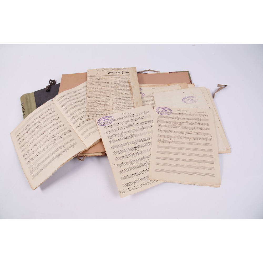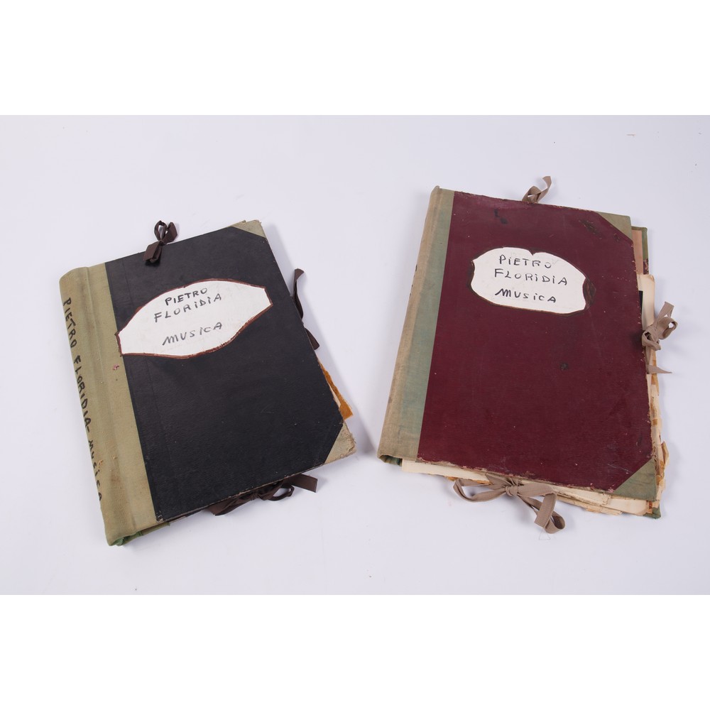 DUE CARTELLE CONTENENTI 31 SPARTITI MUSICALI, dei primi del XX secolo, di autori vari e prime edizioni di opere del famoso musicista modicano Pietro Floridia appartenute alla sorella Corradina. Molti spartiti riportano la firma di appartenenza di Corradina (Dina).
