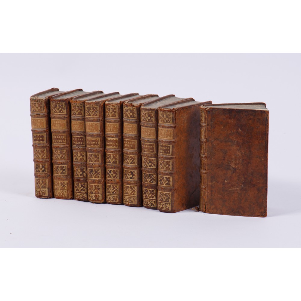 NOVE VOLUMI DI RELIGIONE DEL XVIII SECOLO di Jean Baptiste de Massillon Vescovo di Clermont SERMONS DE M. MASSILLON ÉVÊQUE DE CLERMONT, CI-DEVANT PRÊTRE DE L'ORATOIRE, A Paris: Chez La Veuve Estienne & Fils Et Jean Herissant, 1748 - 1753. I dieci volumi sono suddivisi in: SERMONS, in 4 volumi; AVENT; PANEGIRYQUES; PETIT CAREME; MYSTERES; ORAISONS FUNEBRES ET PROFESSIONS RELIGIEUSES. In 12. I volumi in buone condizioni presentano legature editoriali in piena pelle con titoli in oro e decori floreali al dorso e tagli elegantemente decorati. Qualche sporadica foratura da tarlo ormai debellata al tomo Avent. Leggere bruniture del tempo sparse. Testatine, capilettera e finalini decorati. Pp. (6), 498 (2); (4), 470 (tomo II); 495 (tomo III); (4), 496 (tomo IV). (8) 458 Oraisons Funebres et Profess. Religiueses. XXIV, 348 (3) Petit Careme. (4) 440 Mysteres. (4) 414 Panegyriques. (3) 484 (3) Avent.
