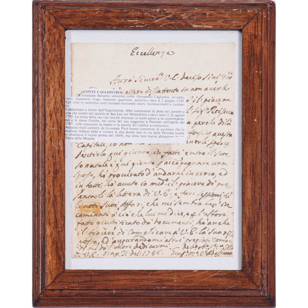 LETTERA AUTOGRAFA DI Giuseppe Balsamo, meglio noto come il sedicente Conte di Cagliostro. Datata 26 Settembre 1786. In cornice novecentesca.