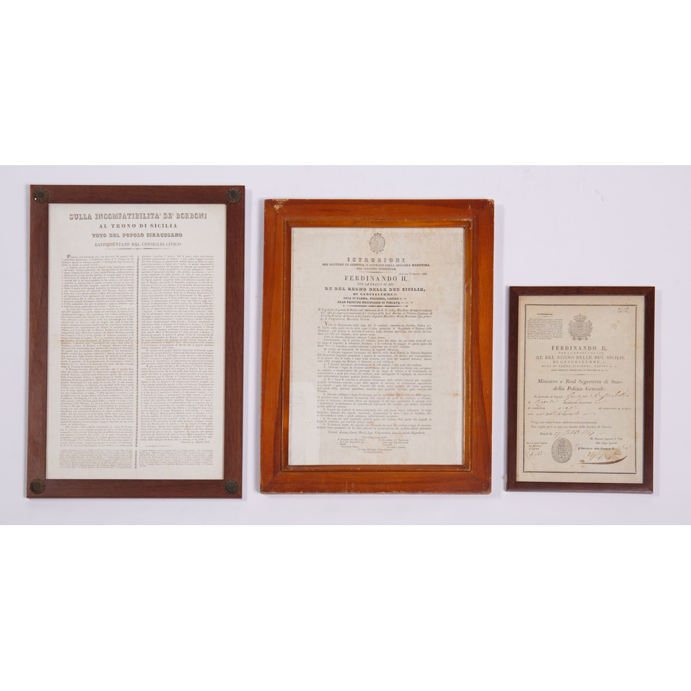 TRE DOCUMENTI A STAMPA DEL XIX SECOLO in cornice novecentesca: 1) Autorizzazione di polizia per la licenza di porto d’armi per un fucile intestato a Giuseppe Arezzo Sortino e datato 27 Febbraio 1847.2) Editto ufficiale relativo alle ISTRUZIONI PER METTERE IN ARMONIA IL SERVIZIO DELLA CROCIERA MARITTIMA COL CORDONE TERRESTRE, datato Palermo 5 ottobre 1836. 3) Raro manifesto dell’Assemblea Comunale di Siracusa, pubblicato a mo’ di “grida” SULLA INCOMPATIBILITA’ DE’ BORBONI AL TRONO DI SICILIA. VOTO DEL POPOLO SIRACUSANO RAPPRESENTATO DAL CONSIGLIO CIVICO, datato Siracusa 19 Ottobre 1848. Siamo nel pieno della Rivoluzione Siciliana del 1848 – 1849. La Rivoluzione di Palermo diede in Europa il via a tutto il processo rivoluzionario comunemente definito il ‘48. Il documento risulta estremamente raro poichè nel periodo della restaurazione borbonica - decreto di Gaeta - tutta questa tipologia venne sistematicamente distrutta essendo divenuto illegale il solo possedere materiale “rivoluzionario”.