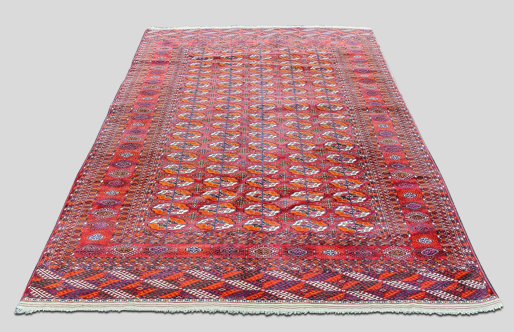 TAPPETO BUKARA fondo rosso, campo con piccoli medaglioni nei toni del nero e dell'arancio cm 288x205
