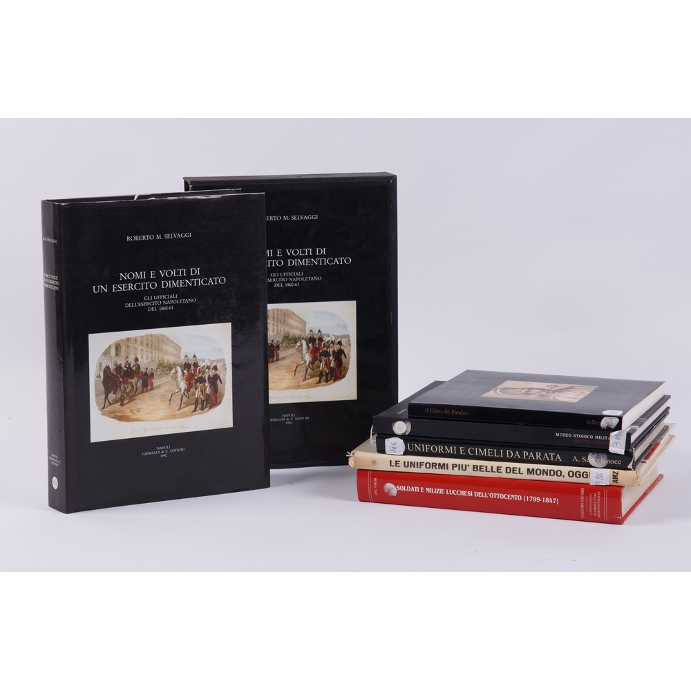 SEI VOLUMI DI MILITARIA: 1) Roberto M. Selvaggi NOMI E VOLTI DI UN ESERCITO DIMENTICATO. GLI UFFICIALI DELL’ESERCITO NAPOLETANO DEL 1860 – 61, ed. Napoli, Grimaldi & C. Editori 1990. Legatura editoriale in tela nera con titoli impressi in oro al dorso. Sopraccoperta editoriale illustrata e cofanetto editoriale illustrato a specchio. Risguardie illustrate. Cm 34,5 x 25. Pp. 457 (4). Opera pubblicata in sole 3000 copie. 2) Aldo Scaccianoce ROMANTICISMO IN PARATA. COLLEZIONI UNIFORMOLOGICHE IN ACIREALE, ed. Banca Agricola Etnea 1994. Legatura editoriale in tela nera con titoli impressi e fotoapplicazione al piatto. Titoli anche al dorso. Sopraccoperta editoriale illustrata. Risguardie illustrate. Cm 29 x 22. Pp. 222.3) Glauco Angeletti MUSEO STORICO MILITARE BRIGATA CATANZARO, ed. Rubbettino, 2007. Legatura editoriale plastificata rigida illustrata. Cm 29 x 23. Pp. 163. All’interno una lettera di Aldo Scaccianoce a Gabriele Arezzo di Trifiletti. 4) AA. VV. LE UNIFORMI PIU’ BELLE D’EUROPA, ed. Editrice AMZ 1966. Legatura editoriale plastificata rigida illustrata. Cm 32,5 x 25. Pp. 93. 5) Bruno Mugnai SOLDATI E MILIZIE LUCCHESI DELL’OTTOCENTO (1799 – 1847), ed. Roma 2005. Legatura editoriale con titoli al piatto e al dorso. Sopraccoperta editoriale illustrata. Cm 30 x 22. Pp. 477. 6) Vincenzo Abbate / Angelo Mazza – a cura di - IL LIBRO DEI PANDURI, ed. Sellerio, Palermo 1994. Brossura editoriale illustrata con ali. Cm 24 x 22. Pp. 207.