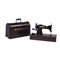 Macchina da cucire Singer da viaggio modello 2x57 con supporto e custodia in bachelite guarnita da dorature a fuoco. La macchina all'interno è anch'essa decorata con rabeschi floreali ottenuti a fuoco.
