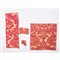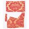 Sette frammenti di tessuto lampasso di seta fondo oro con decoro rosso porpora.