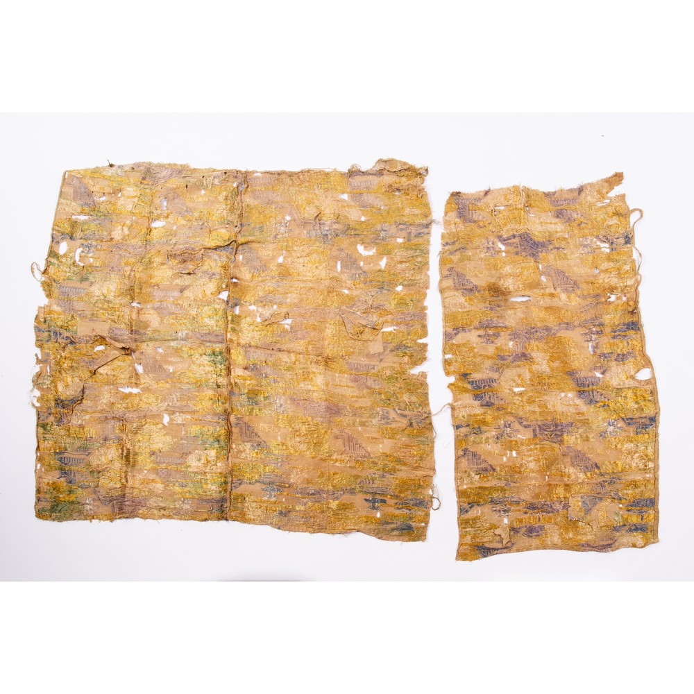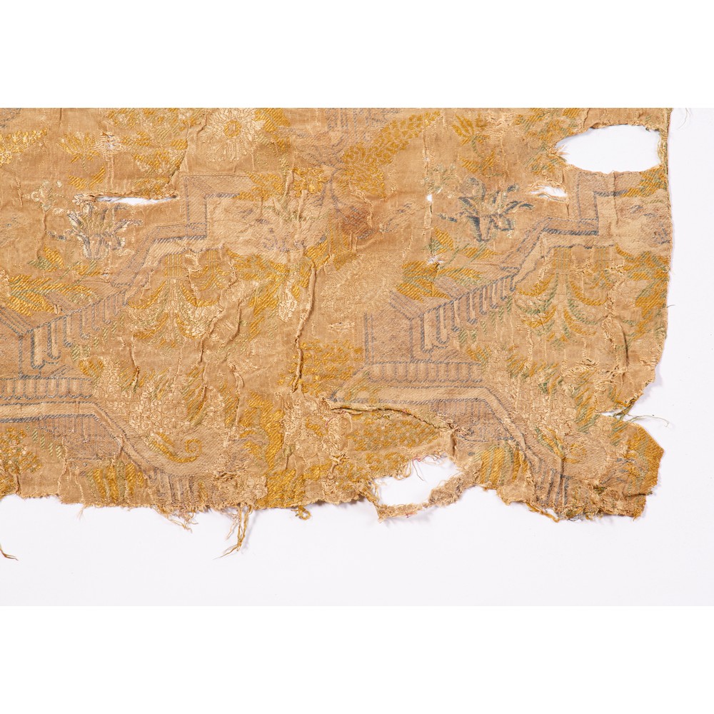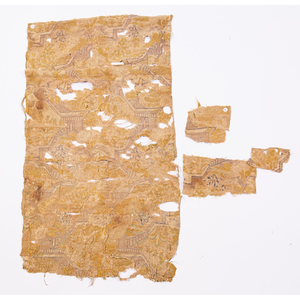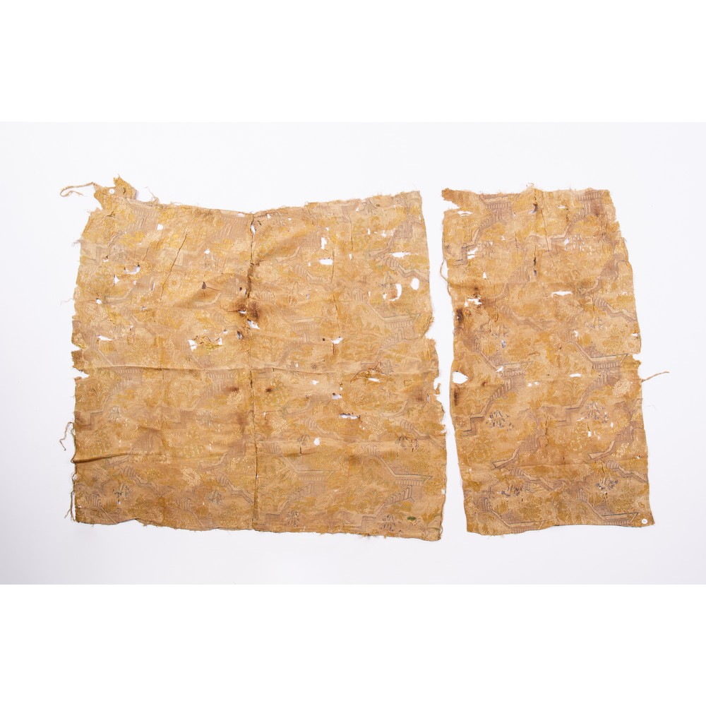 Due frammenti di tessuto lampasso fondo ocra con decoro rosso porpora de XVI secolo; sei frammenti in lampasso di seta ocra con magnifico decoro policromo a giardino del XVII secolo.