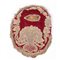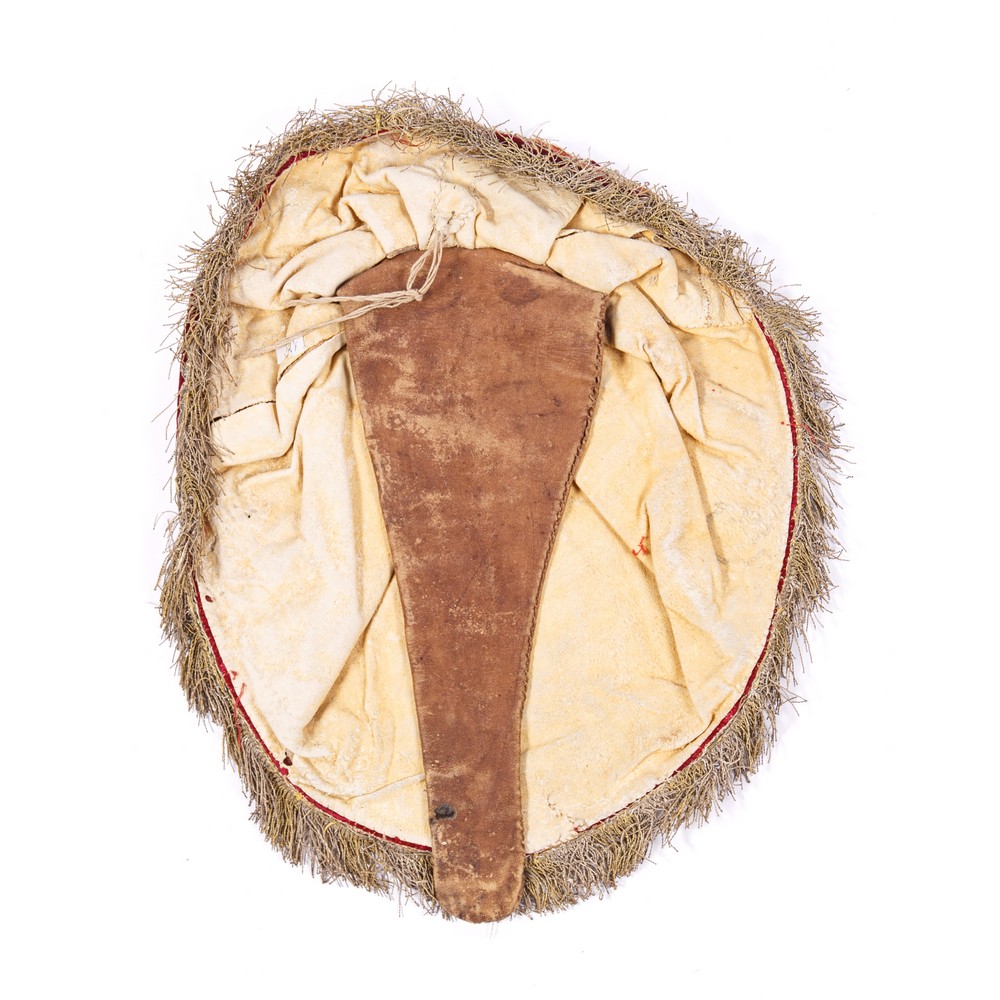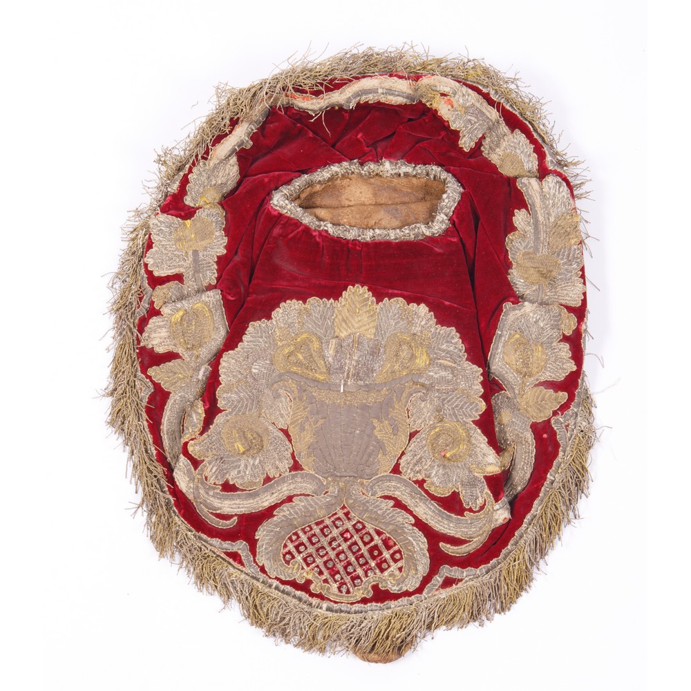 Fastoso porta pistola da cavallo per parata. Drappo sagomato in velluto color marrone orlato da grossi fastosi ricami di filo d'argento e d'oro intessuto con volute ,motivi floreali e un grande vaso. L'orlo è rivestito da un cordone di filo d'oro e canutiglia d'argento. Fodera in pelle e alloggio per arma anch'esso in pelle sagomata.